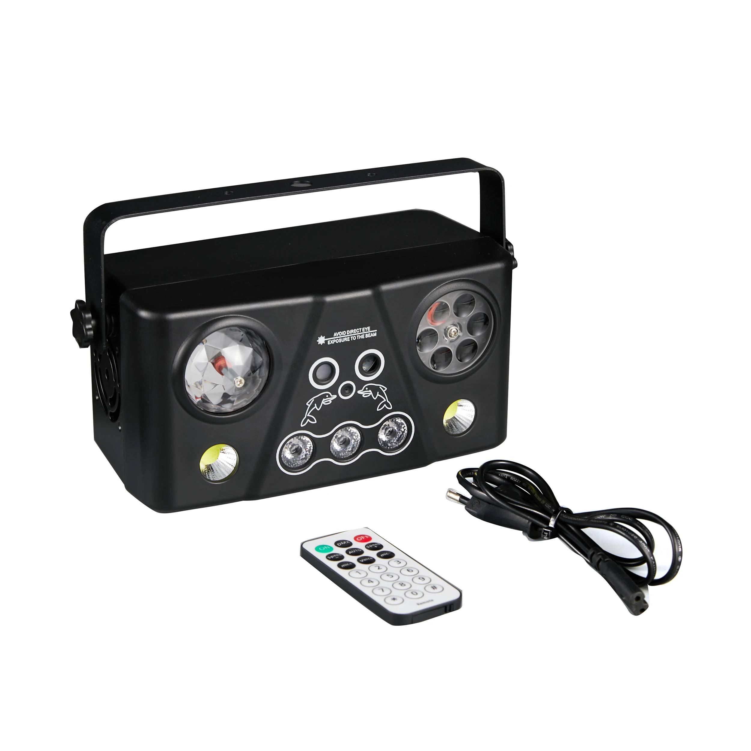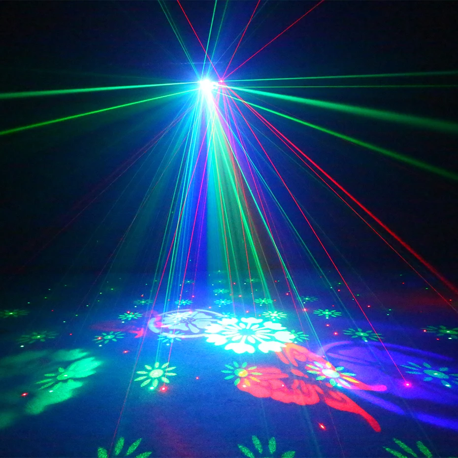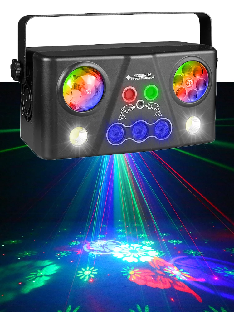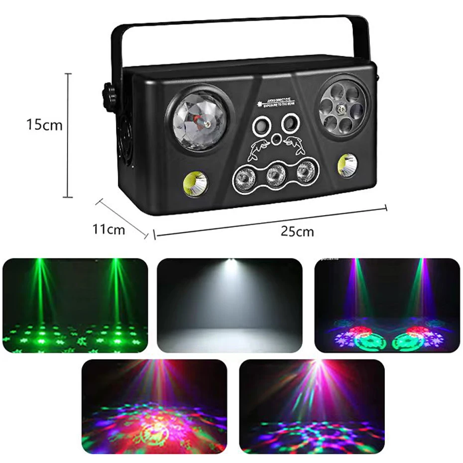 [Efectos 5 en 1] Estroboscópico Blanco/Gobo LED/Patrones láser RG/Luz de bola mágica LED RGB/Teñido RGB