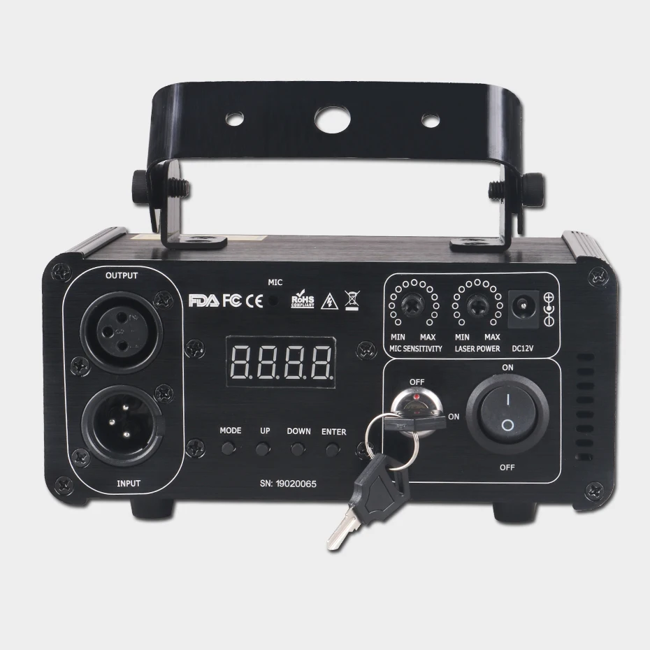 El láser es un sistema láser rojo, verde y azul a todo color. Las fuentes láser garantizan colores brillantes y potentes rayos láser. El láser RGB incluye un control remoto IR para control inalámbrico y para cambiar entre programas activados por sonido o automáticos. En el modo DMX también tiene un control total de todos los patrones, movimientos de la X-Y, zoom, velocidad y rotación. Es ideal para aplicaciones semiprofesionales y es perfectamente adecuado en bares, clubes medianos y discotecas. Así como para empresas de alquiler, DJs móviles, uso privado y en cualquier otra ubicación de fiesta.