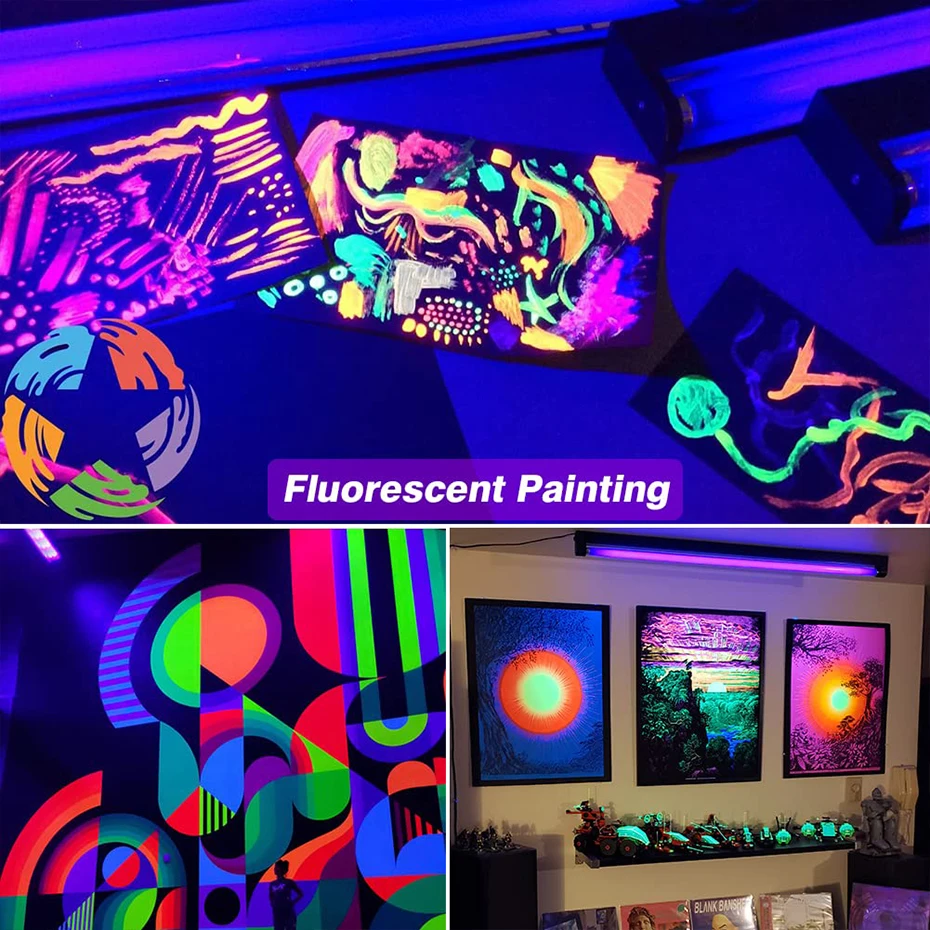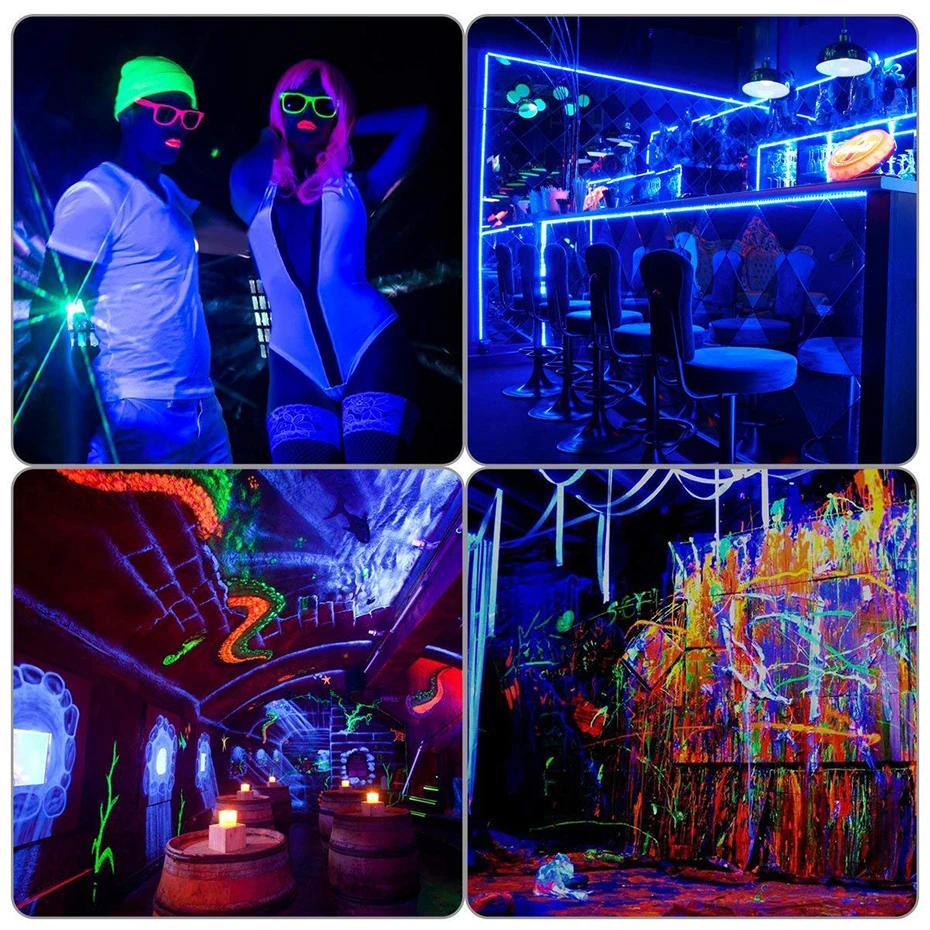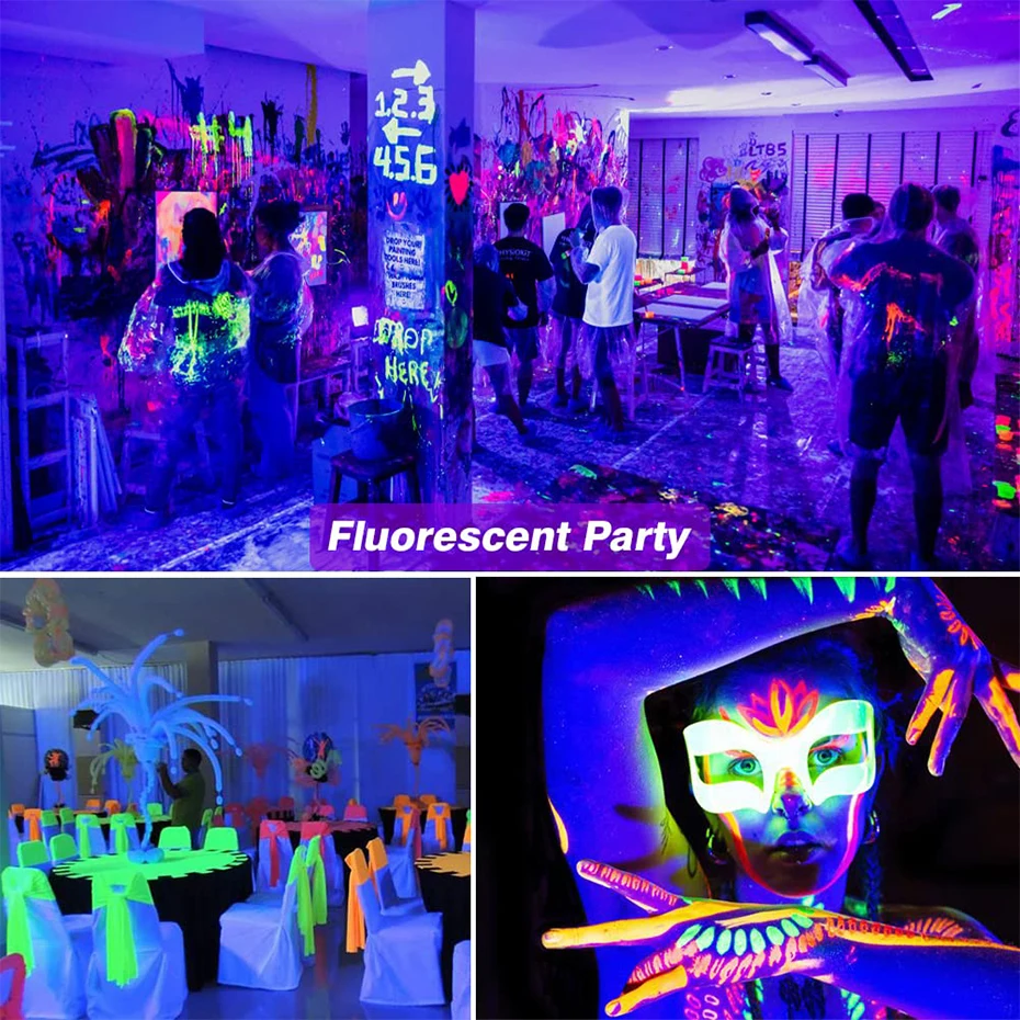 Por ejemplo, globos de fiesta Blacklight, pinturas UV para la cara y el cuerpo, lápiz labial UV, esmalte de uñas con luz negra UV, delineador de ojos y rímel de luz negra UV, sombreros de gángster de color neón, cinta que brilla en la oscuridad, póster UV, etc. ¡Especialmente adecuado como luz de ambiente para Halloween!