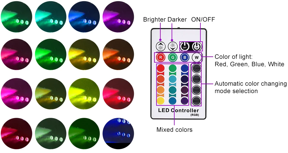 1 * Control remoto (construido en batería) 1*12 colores Control remoto (construir-en la batería) 1 * mango 2 * tornillos de montaje 1 * Manual de usuario (Inglés)