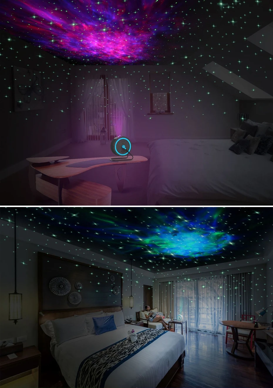 El proyector de espectáculo de luces ALIEN decorará cualquier habitación de su hogar como una luz de estrella de fiesta, una luz de noche bonita o un proyector de luz de estrella para dormitorio, sala de estar, etc. Para crear un ambiente muy especial, refleja las verdaderas características del cielo estrellado y las olas de agua. También es un gran regalo de cumpleaños para los niños o su amor.
