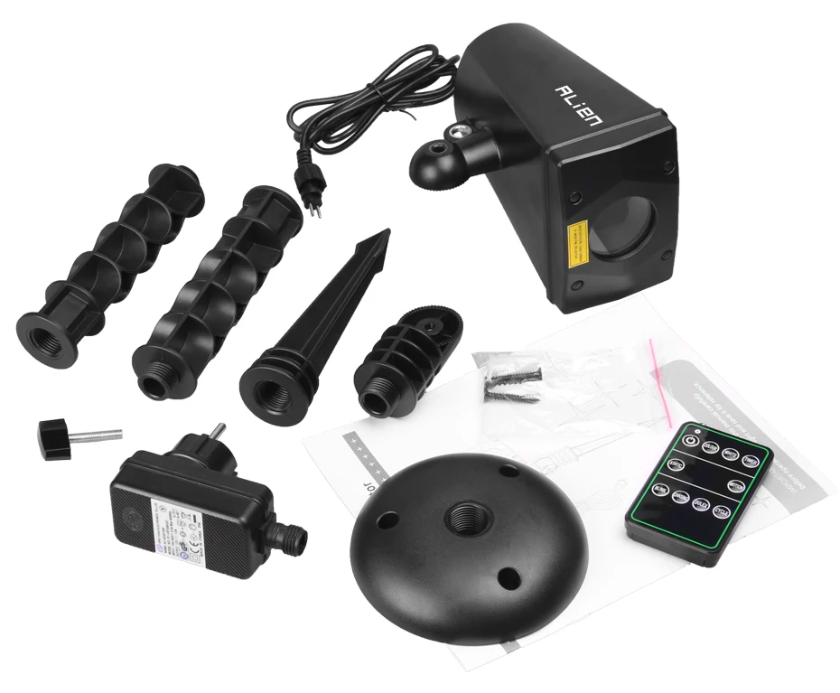 Proyector láser blanco * 1, control remoto * 1 (batería no incluida), adaptador (IP44) * 1, Estaca de tierra * 1, conector * 1, base * 1, extensor * 2, manual del usuario * 1