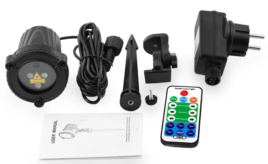 IP65 Waterproof Laser Projector with 3 Meter ( 9.8ft ) Cable * 1 , Power Adapter * 1 , Screw Pack * 1 , Stand * 1 , RF Remote Control * 1 , User Manual (English) * 1.