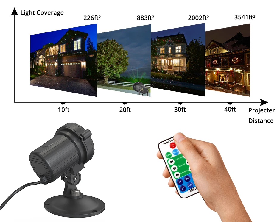 ALIEN Outdoor Laser can project from over 40ft away and cover over 1000 square feet. Buy two or more for spectacular results.