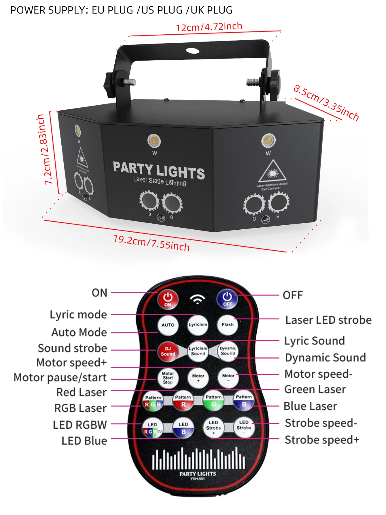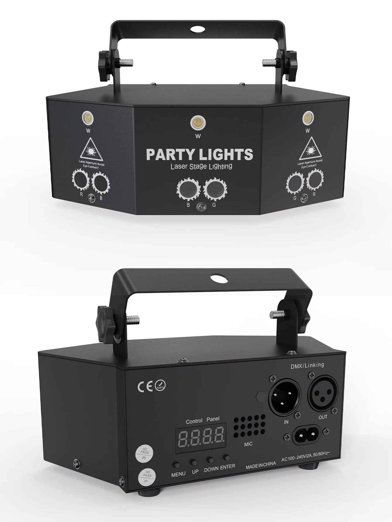 Total en 125 combinaciones de imágenes formadas con 24 patrones en luces RGB. Fácil de ajustar la velocidad de la luz. Seis fuentes con nueve fuentes LED. Doble rendimiento del sistema (al mismo tiempo para los modos automático y activado por música).