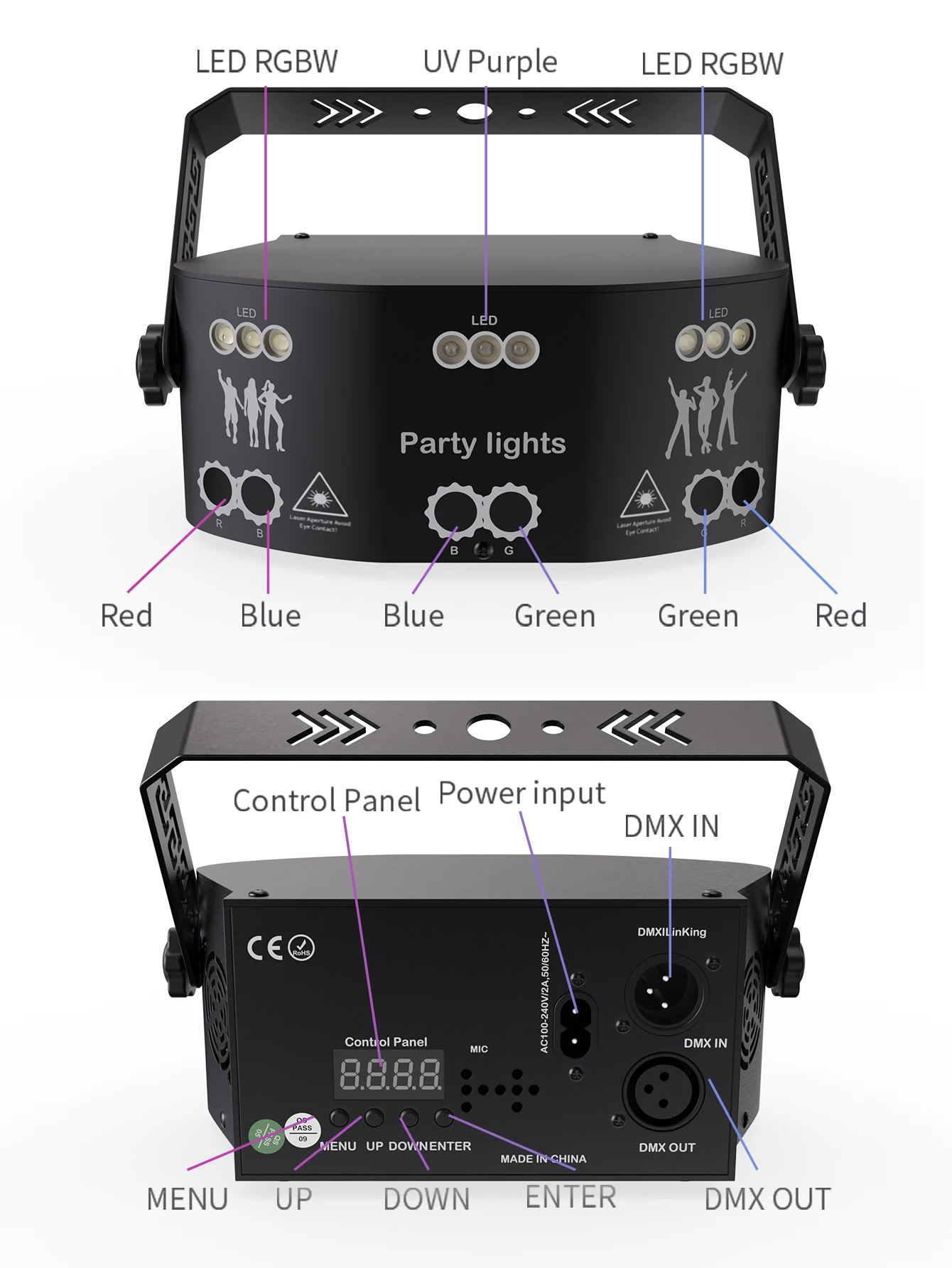 Láser RGB de 15 orificios + LED RGB + LED UV