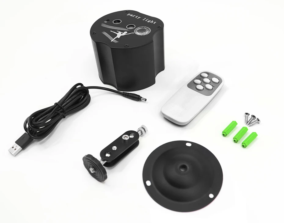 1 * Luz láser, 1 * Control remoto, 1 * Cable USB, 1 * Soporte fijo, 3 * Tornillos, 1 * Manual de usuario