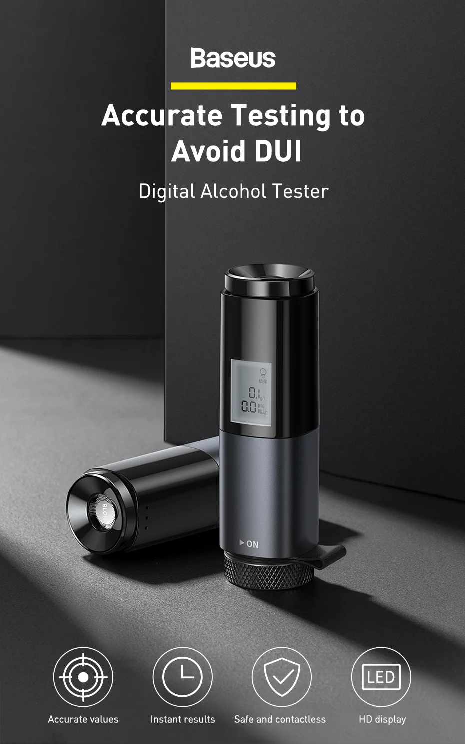 • Pruebas automáticas :El probador de alcohol sin contacto portátil Baseus prueba automáticamente los niveles de alcohol, lo que lo hace más rápido y más eficiente que los métodos de prueba manuales.