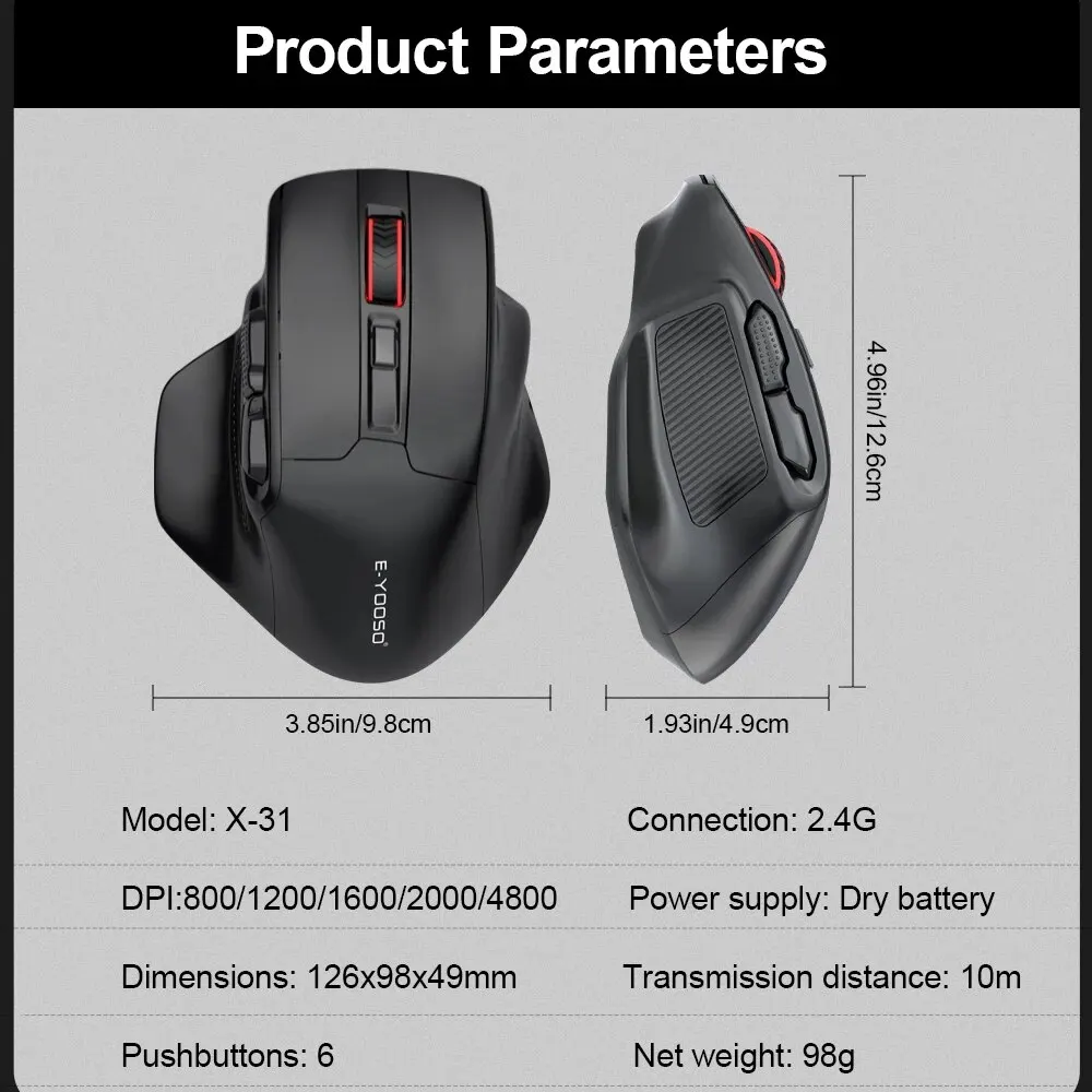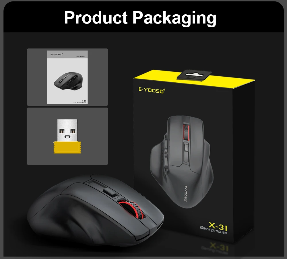 • 5 botones para un fácil acceso :El ratón grande para juegos inalámbricos USB 2,4G de E-YOOSO X-31 tiene 5 botones, lo que facilita el acceso a todas sus funciones favoritas sin tener que desplazarse por los menús.
