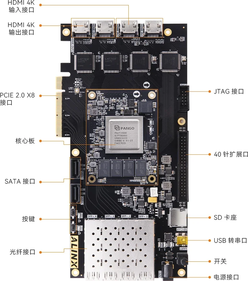 Al adoptar un modo de agregar una placa central y una placa de expansión, facilita el desarrollo secundario y la utilización de la placa central de los usuarios.Interfaces periféricas ricas, que incluyen 1 interfaz PCIe 2.0x 8, 4 interfaces de fibra óptica, 2 interfaces de salida HDMI, 2 interfaces de entrada HDMI, 2 interfaces SATA, 1 interfaz serie UART, 1 interfaz de tarjeta SD, 1 interfaz de expansión de 40 pines, etc.Cumplir con los requisitos de varios transmisiones de datos PCIe de alta velocidad, procesamiento de imágenes de vídeo y control industrial para los usuarios.Prevalida y posterior aplicación de transmisión de vídeo de alta velocidad, comunicación de fibra óptica de alta velocidad y procesamiento de datos PCIe