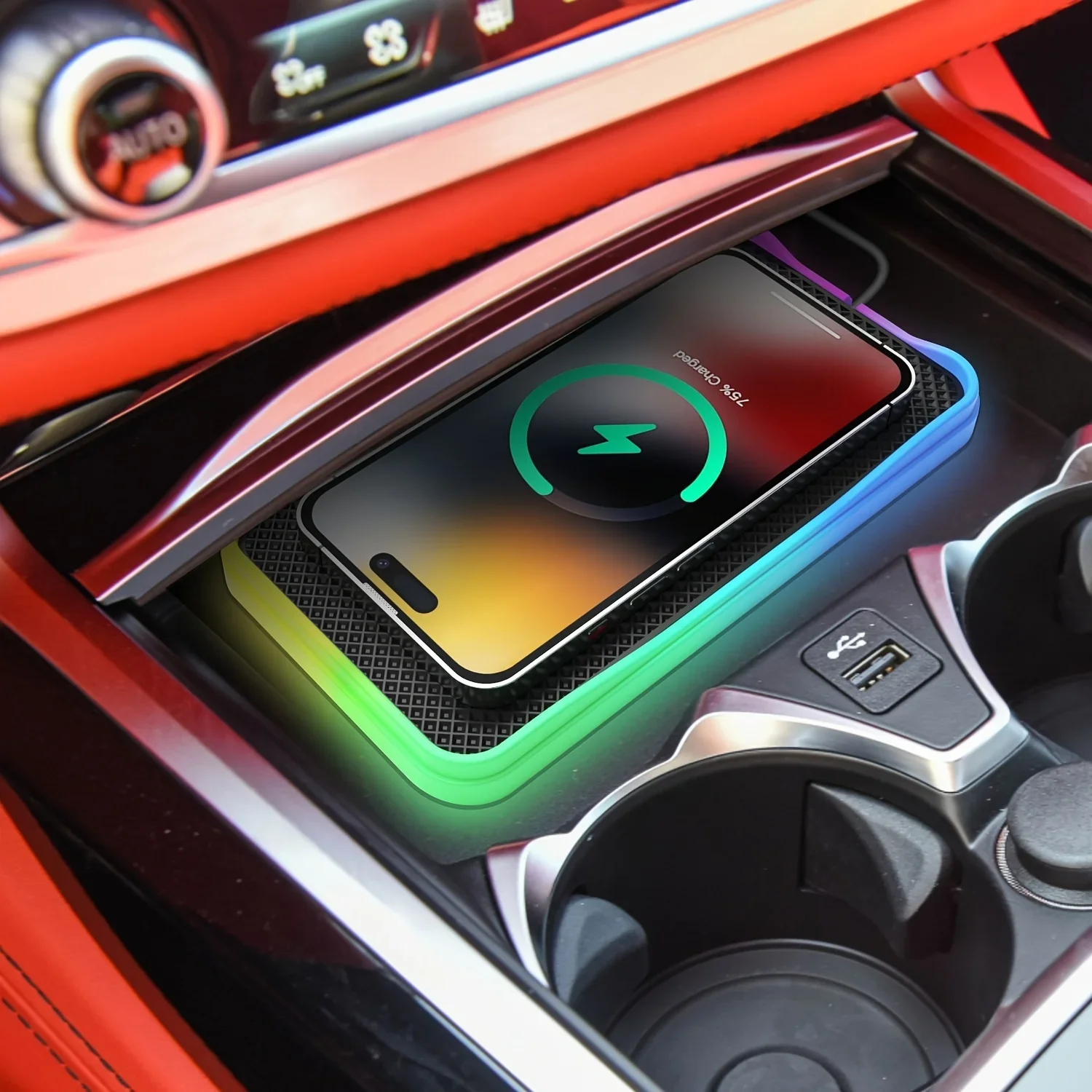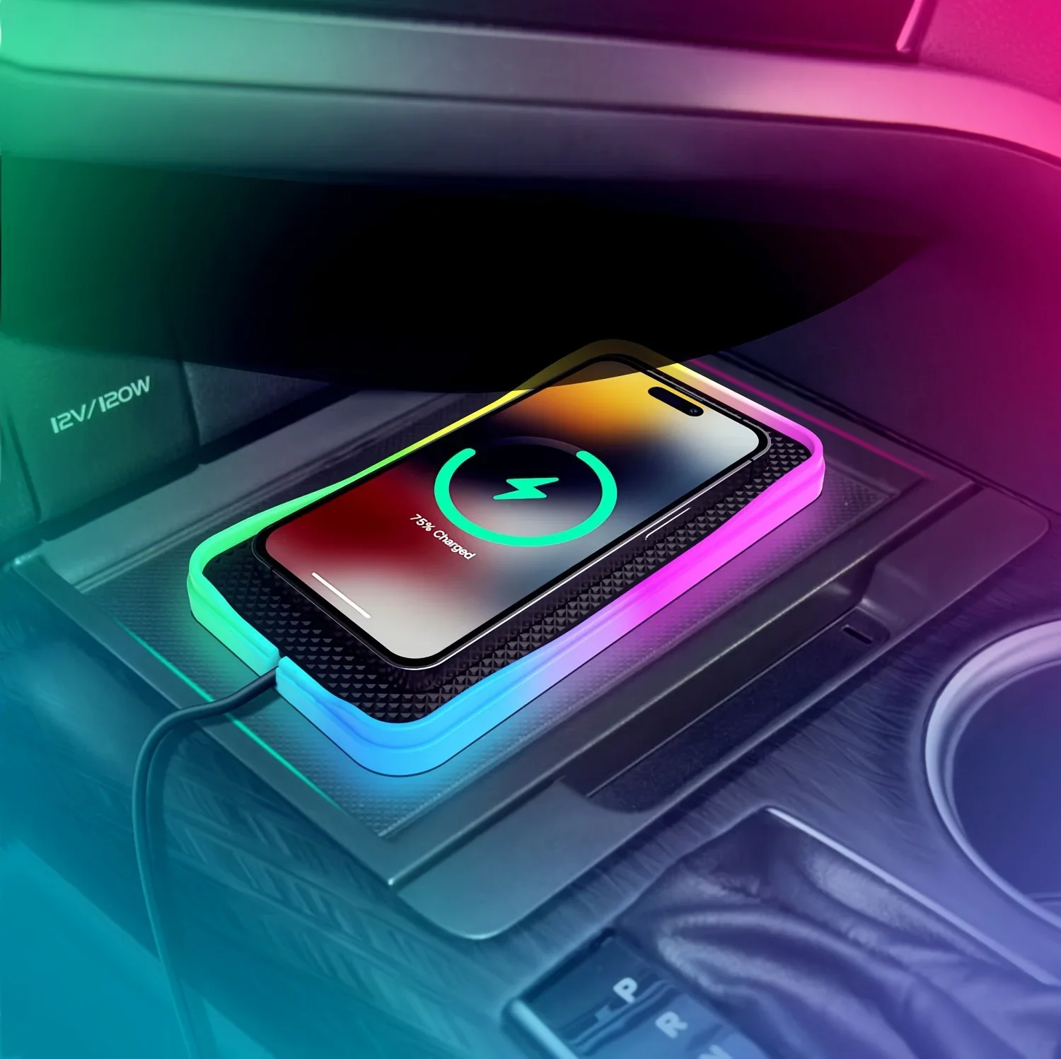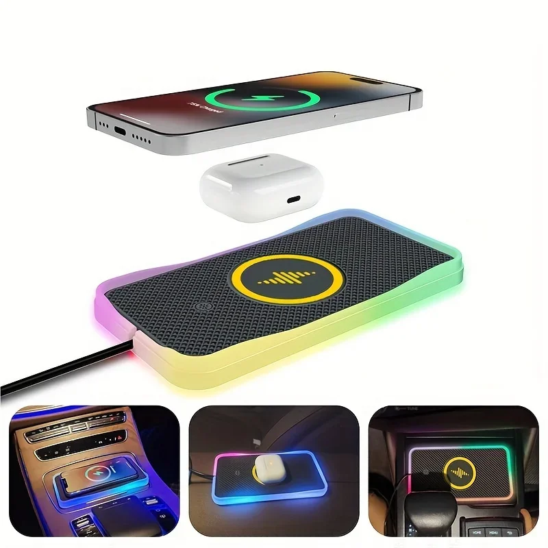 This car wireless charging pad is mainly to make full use of the car's storage space, in addition to charging mobile phones, in order to maximize the use of wireless chargers, we also added Three functions. First, it can charge TWS earphones with wireless charging function; secondly, in order to give the car more sense of technology, RGB 7-color gradient breathing lights are added, Third, one hand touch to control the RGB Light.