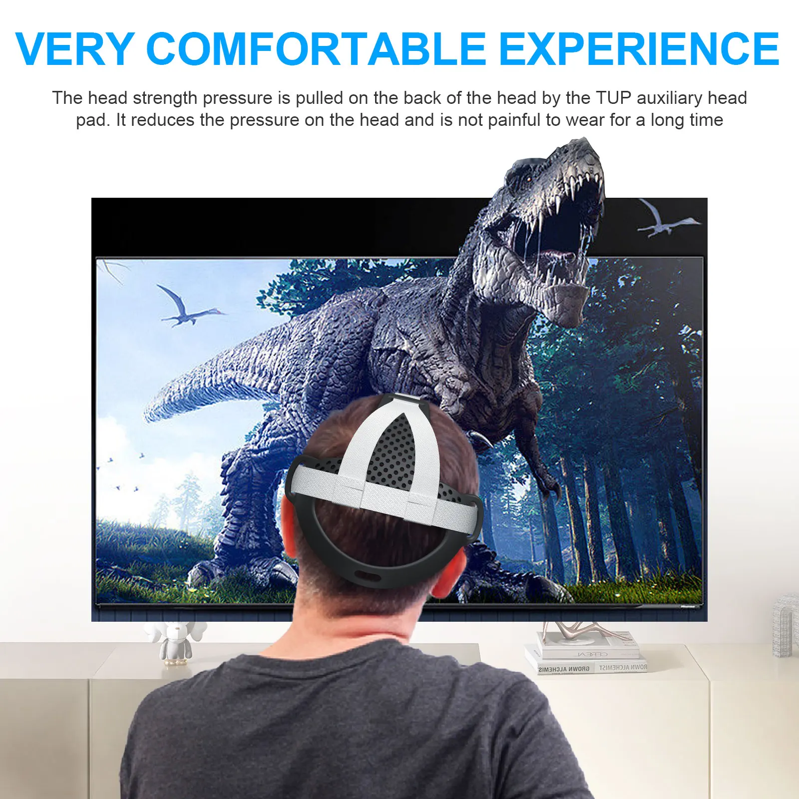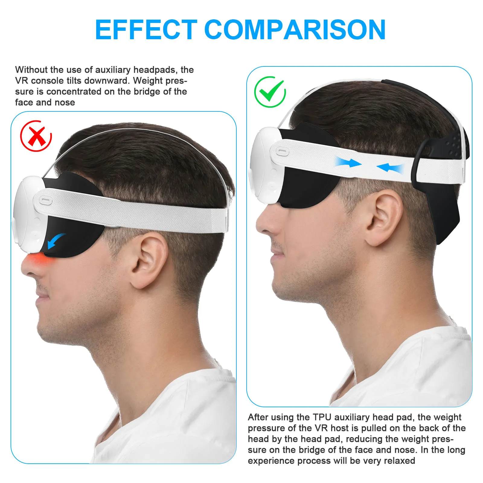 2.Cómodo alivio de la presión:El diseño curvo del cojín para la cabeza, junto con la almohadilla auxiliar de TPU, proporciona mayor comodidad.La presión del peso de los auriculares VR se distribuye en la parte posterior de la cabeza, lo que reduce la presión sobre la cara y el puente de la nariz, lo que permite un uso prolongado relajado y sin dolor durante experiencias prolongadas.