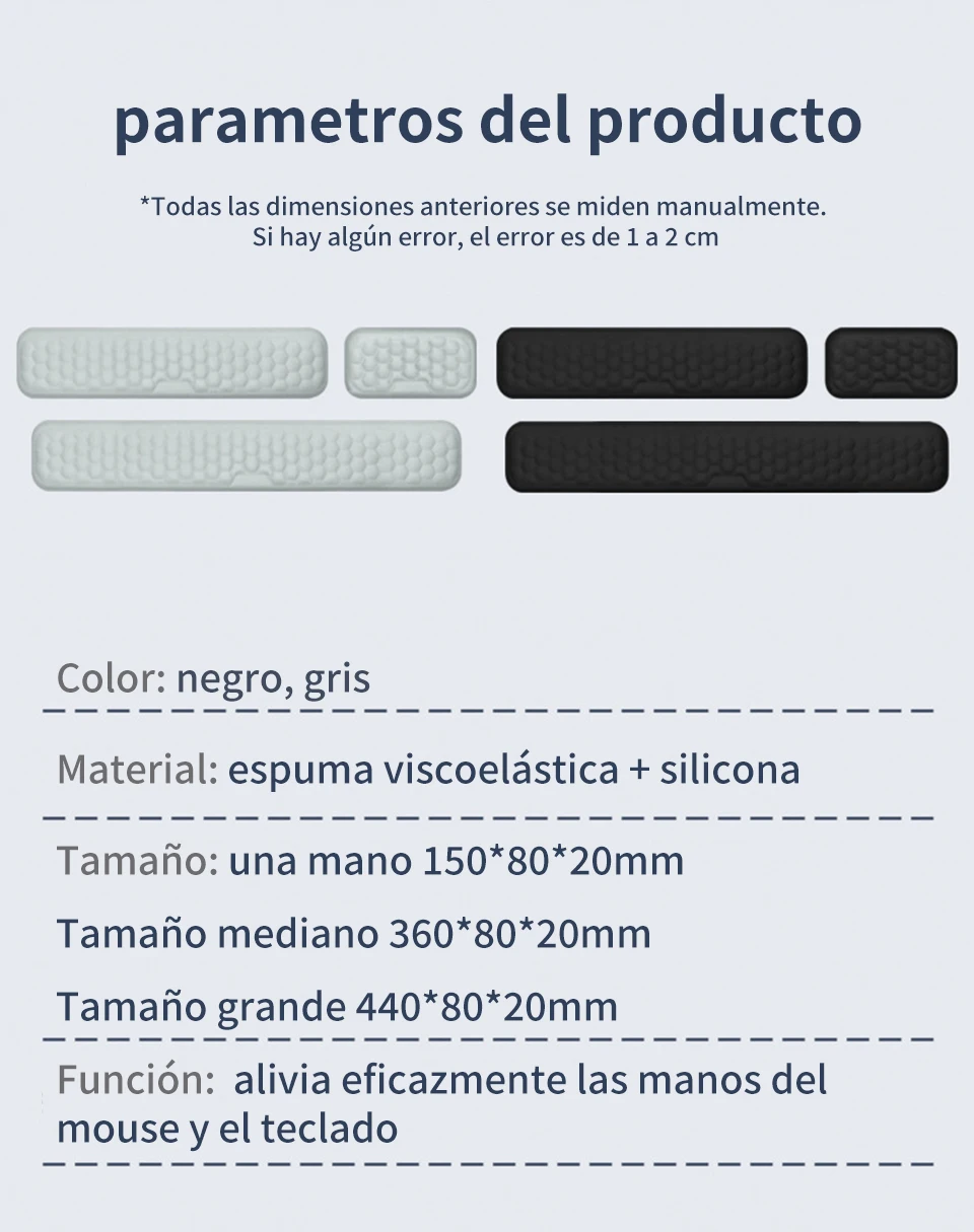 Presentación del color del producto:Color A: reposamuñecas de teclado gris (440*80*20mm),¡Sin reposamuñecas de ratón!Color B: reposamuñecas de teclado negro (440*80*20mm),¡Sin reposamuñecas de ratón!Color C: reposamuñecas de teclado gris (360*80*20mm),¡Sin reposamuñecas de ratón!Color D: reposamuñecas de teclado negro (360*80*20mm),¡Sin reposamuñecas de ratón!Color E: reposamuñecas de ratón gris (150*80*20mm),¡Sin reposamuñecas para teclado!Color F: reposamuñecas de ratón negro (150*80*20mm),¡Sin reposamuñecas para teclado!Color G: reposamuñecas gris para ratón (150*80*20mm) + reposamuñecas para teclado (440*80*20mm)Color H: reposamuñecas de ratón negro (150*80*20mm) + reposamuñecas de teclado (440*80*20mm)Color I: reposamuñecas de ratón gris (150*80*20mm) + reposamuñecas de teclado (360*80*20mm)Color J: reposamuñecas de ratón negro (150*80*20mm) + reposamuñecas de teclado (360*80*20mm)Si necesita un reposapiés para teclado y un reposamuñecas para ratón, ¡puede comprarlos juntos!Características:Reposamuñecas con textura de masajeLa superficie del reposamuñecas tiene textura de silicona, la parte inferior es antideslizante de PU, relleno de espuma viscoelásticaTiene la función de soporte de muñeca para evitar lesiones en la muñeca