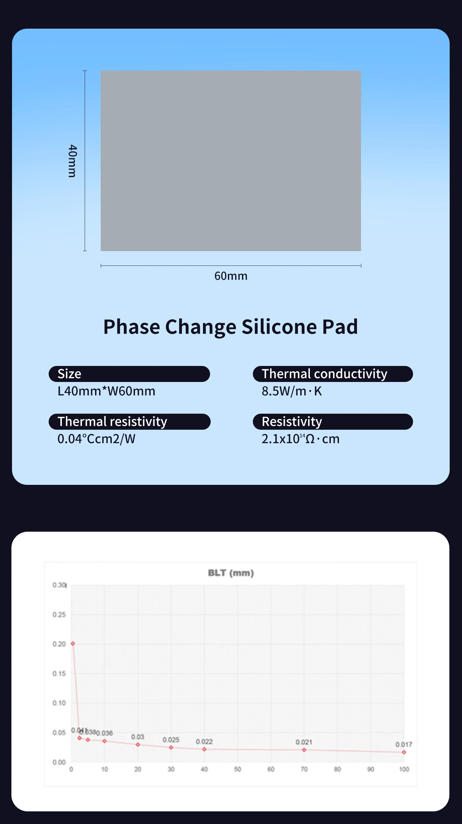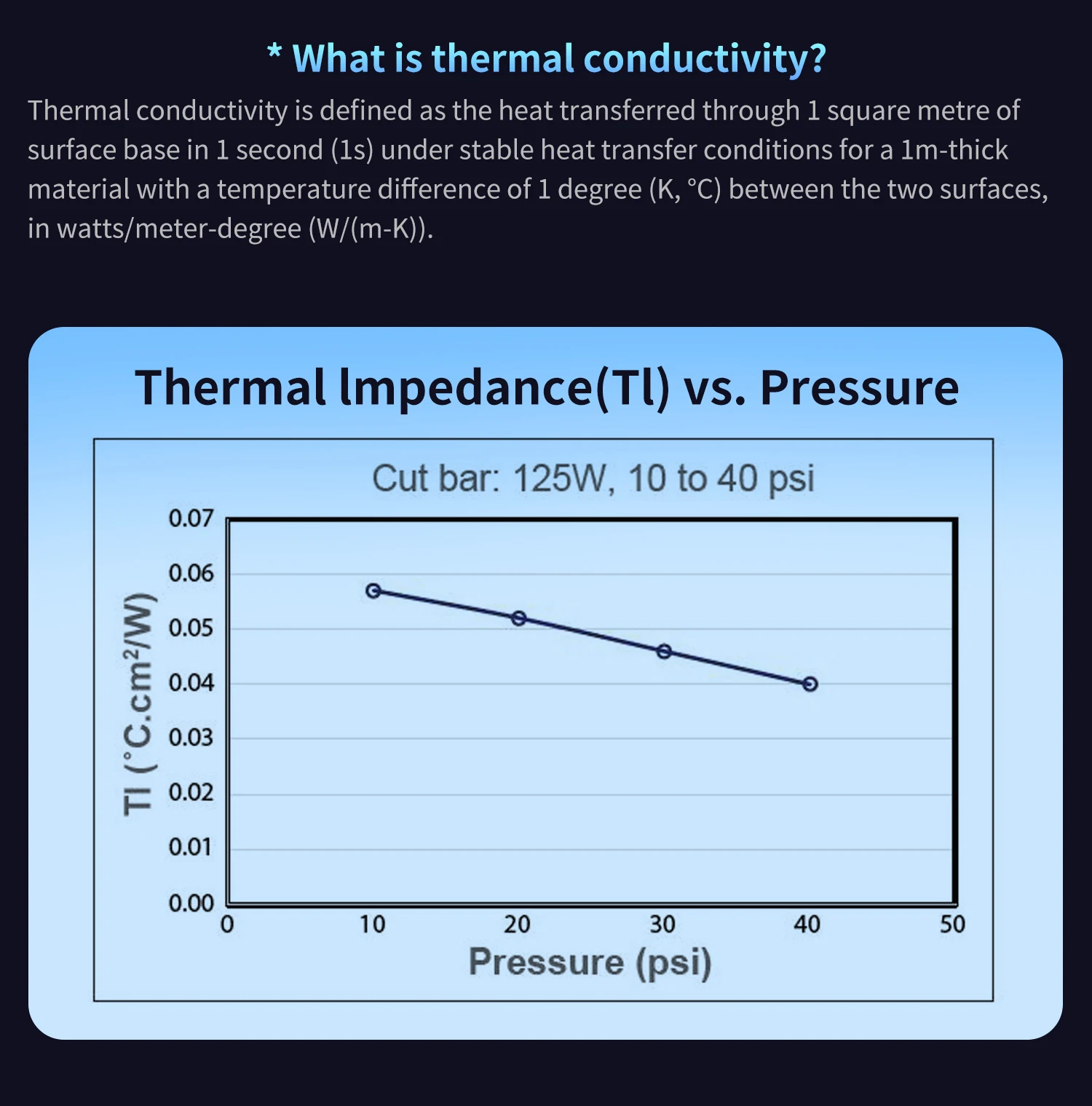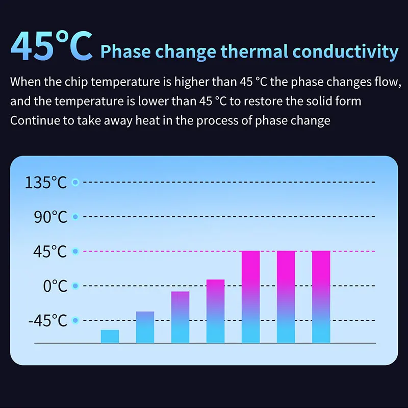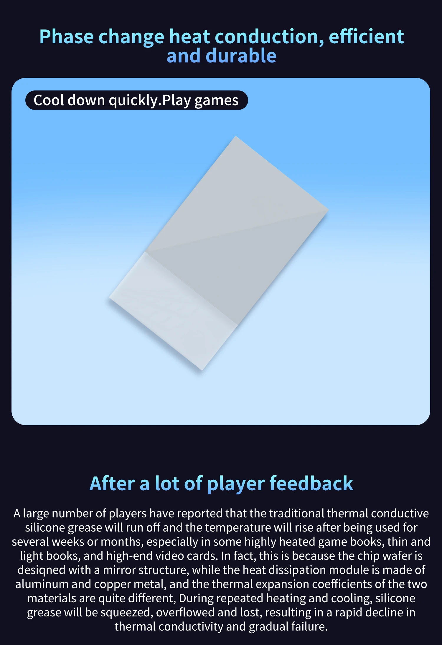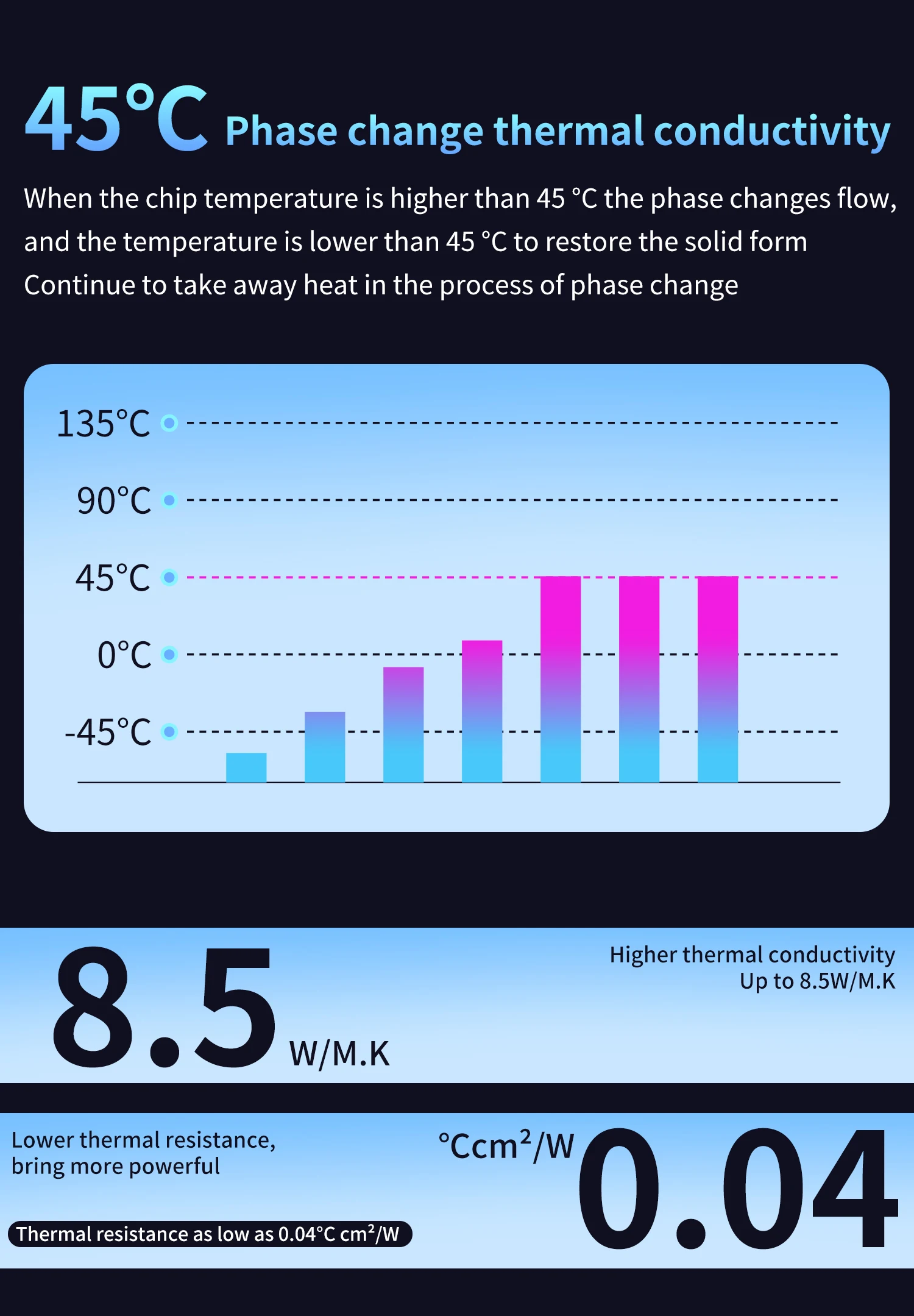 Basado en un novedoso sistema PCM de polímero, exhibe una excelente humectabilidad de la interfaz durante rangos típicos de temperatura de funcionamiento, lo que resulta en una resistencia de contacto superficial extremadamente baja.debe estar seguro de que este grosor es compatible y adecuado para la planitud de su paquete.