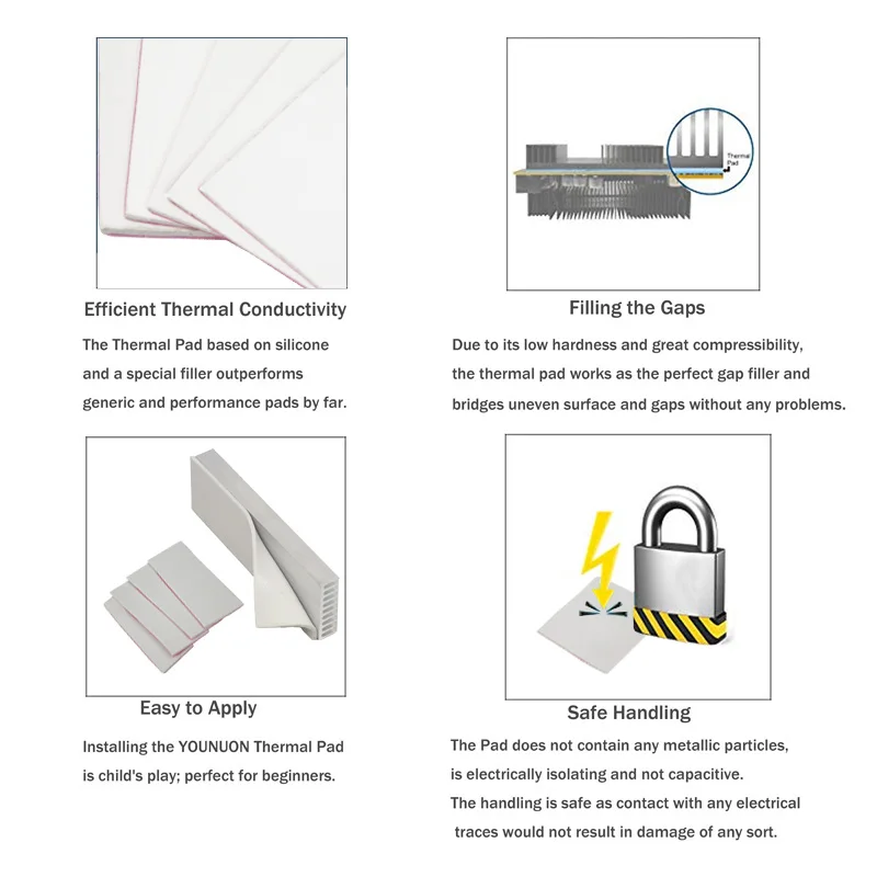 Llenar los huecos: debido a su baja dureza y gran compresibilidad, la almohadilla térmica funciona como el relleno de huecos perfecto y une superficies irregulares y huecos sin ningún problema.