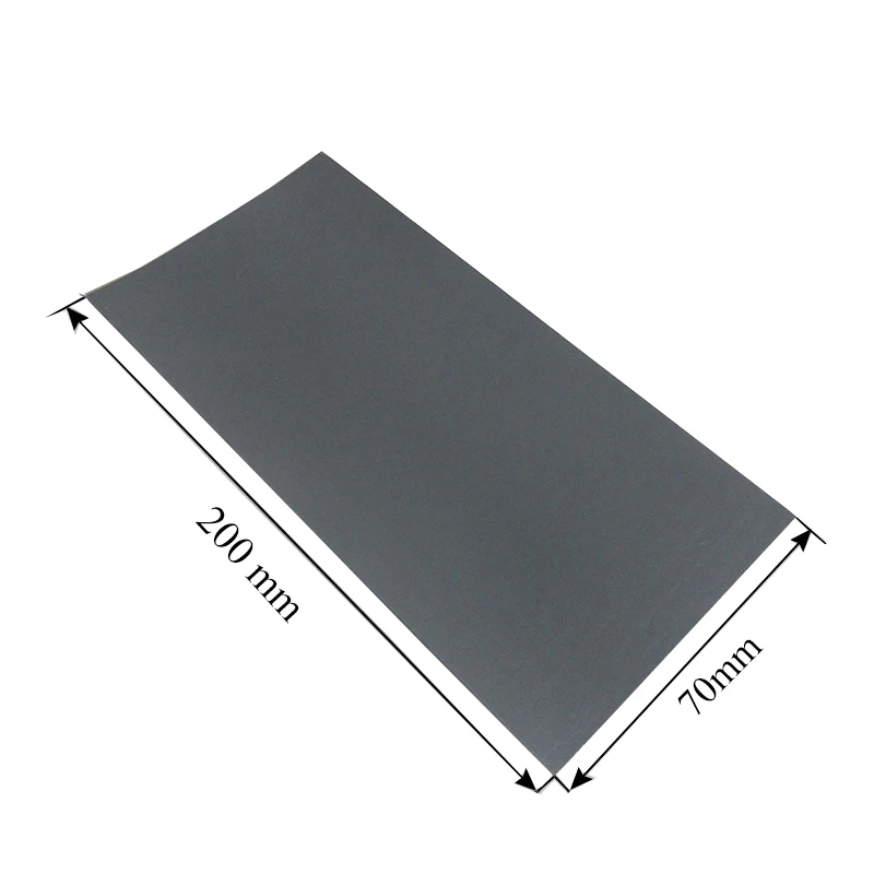 3.cColor: gris negroTamaño: 200mm x 70mmEspesor: 0.025mmConductividad térmica Horizontal: 1500 ~ 1800 W / m.kConductividad térmica Vertical: 15 ~ 20 W / m.kTemperatura máxima: 1200 ° CConductividad: 19000 s/cmClasificación de fuego UL: 94VO