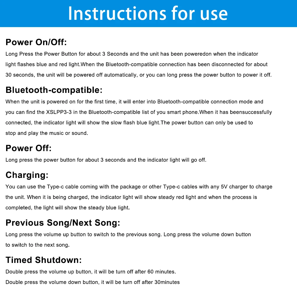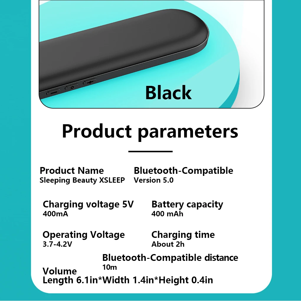Conducción ósea: Este altavoz debajo de la almohada puede transferir el audio a través del hueso, por lo que no molestará fácilmente a los demás mientras trabaja.Largo tiempo de trabajo: Batería de polímero de gran capacidad incorporada, este altavoz inalámbrico puede proporcionar 20 horas de tiempo de reproducción de música y tiene 300 horas de tiempo de espera.Fácil de conectar: compatible con Bluetooth 5,0, este subwoofer debajo de la almohada es fácil de conectar con la mayoría de los tipos de teléfonos y tabletas.Apagado automático: Este altavoz inalámbrico de conducción ósea se apagará automáticamente después de 30 minutos, por lo que no es necesario apagarlo manualmente mientras duerme.Otra función: esta caja de sonido debajo de la almohada es compatible con una tarjeta de memoria, que le permite reproducir música MP3 directamente desde la tarjeta de memoria.Especificación:Versión compatible con Bluetooth: 5,0.Rango de conexión: aprox. 10M/32,81 pies.Material: plástico.Voltaje de funcionamiento: 3,7-4,2 V.Unidad de vocalismo: conducción ósea.Rango de respuesta de frecuencia: 40Hz-20KHz.Tasa S/R: ≥ 75dB.Batería: Batería de polímero, 400mAh (incorporada).Tiempo de reproducción de música: unas 20 horas.Tiempo en espera: alrededor de 300 horas.Voltaje de carga: 5V, 400mA.Tiempo de carga: aproximadamente 2 horas.Tamaño (LxWxH): Aprox. 15,5x3,6x1,2 cm/6,10x1,41x0,47 pulgadas.Canal: 2.Audio cruzado: rango completo.Potencia de entrada: 25W.Potencia nominal: 4W.Impedancia: 2Ω.Sensibilidad: 32dB.Distorsión Armónica Total: 1%.Nota:Puede haber un poco de distorsión de color debido a las diferentes resoluciones del ordenador.Puede haber un ligero error debido a diferentes medidas manuales.El paquete incluye:Altavoz de 1 pieza (con cable de carga de 1 pieza, manual de usuario de 1 pieza).
