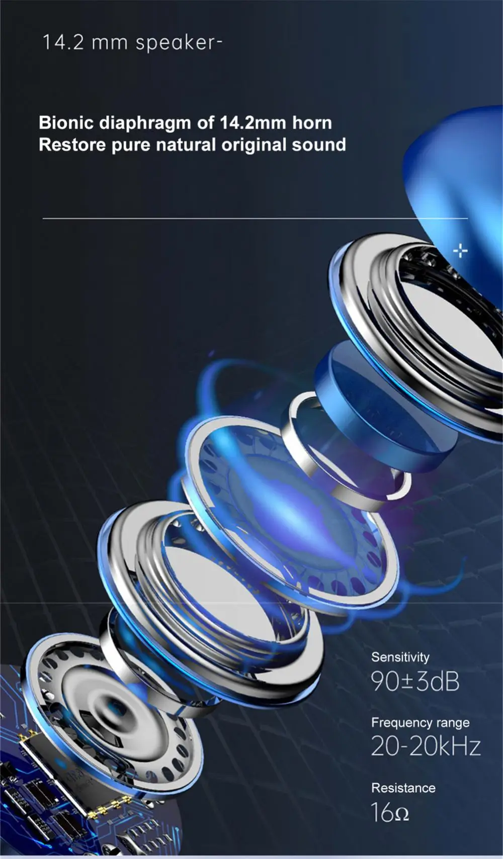 1 【 Diafragma biónico de altavoz de 14,2mm 】 Restaure el sonido natural puro, música instrumental vocal delicada con tambor creciente, deje que su cerebro sienta una música envolvente diferente