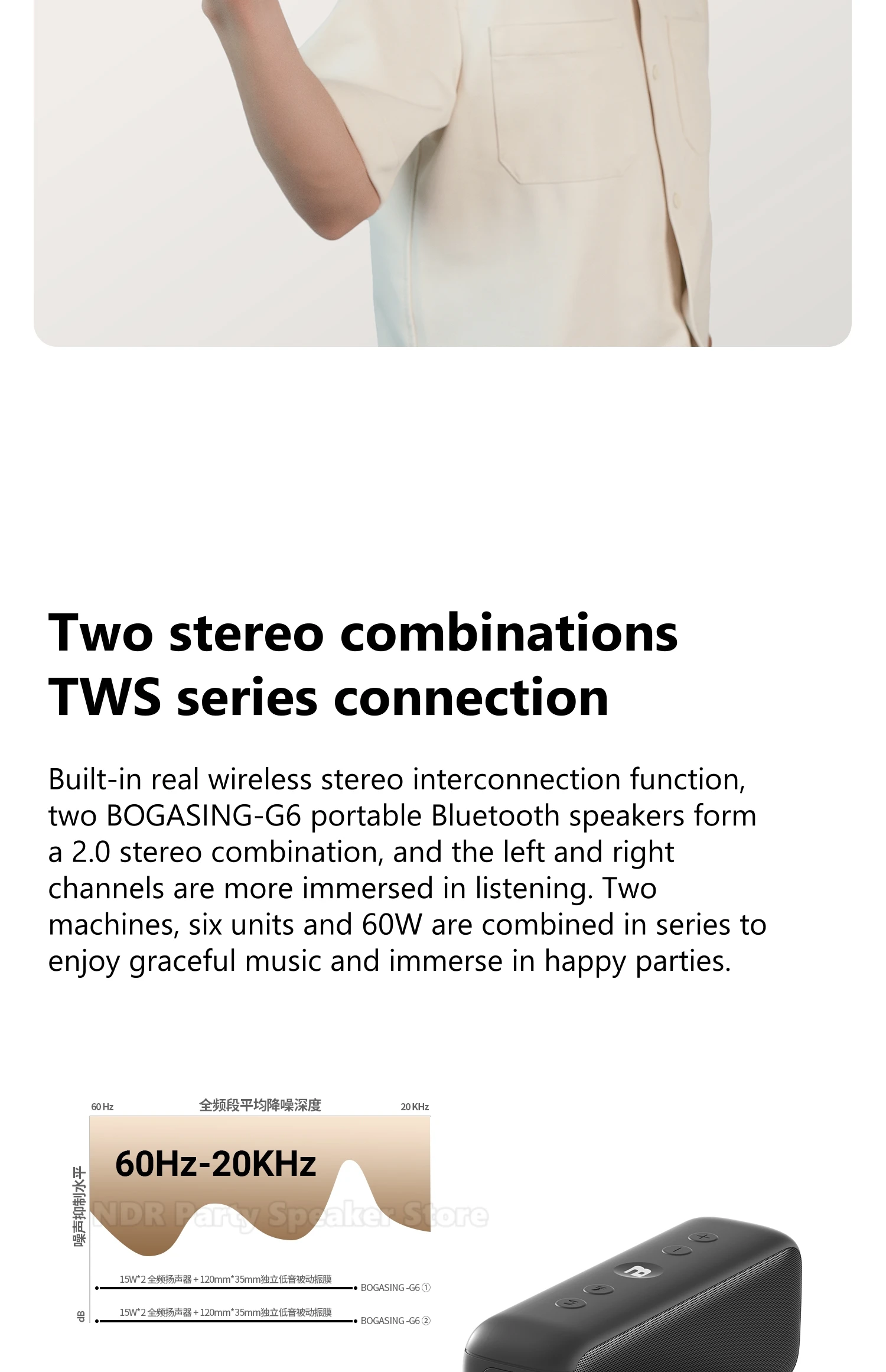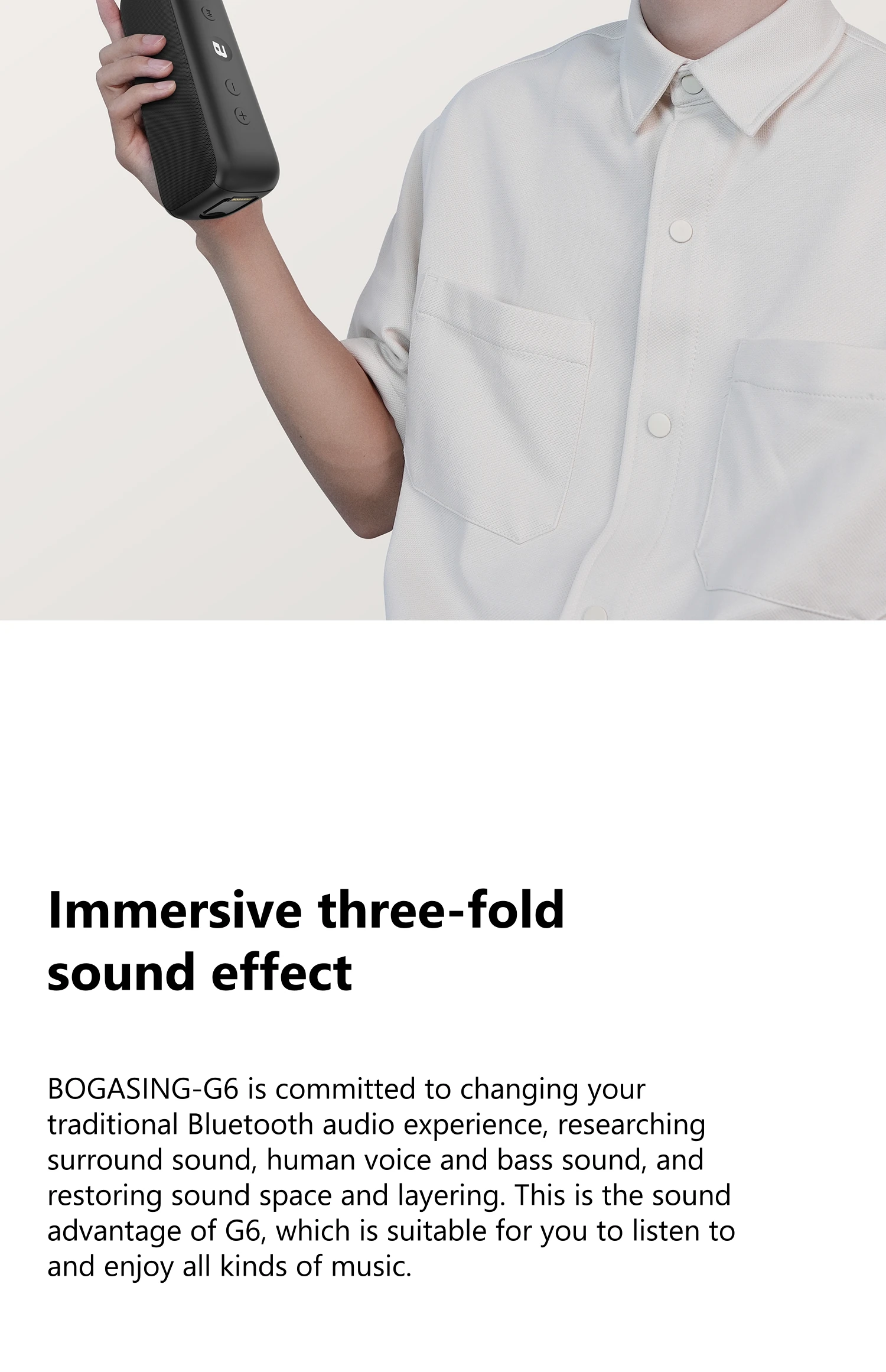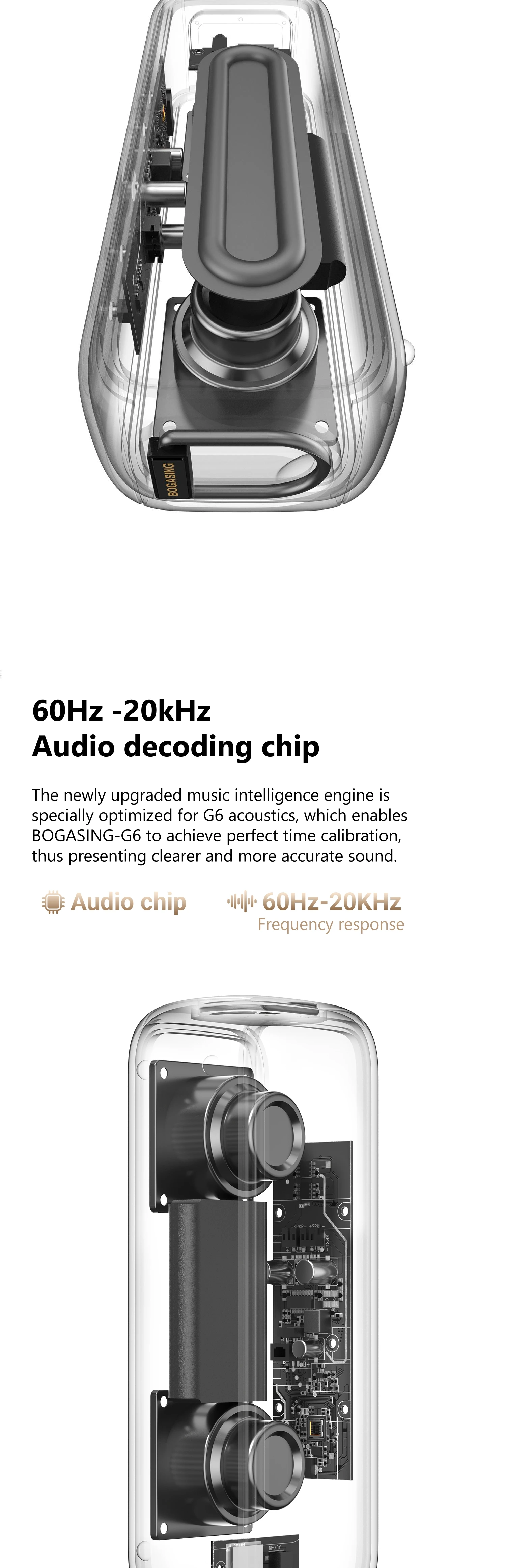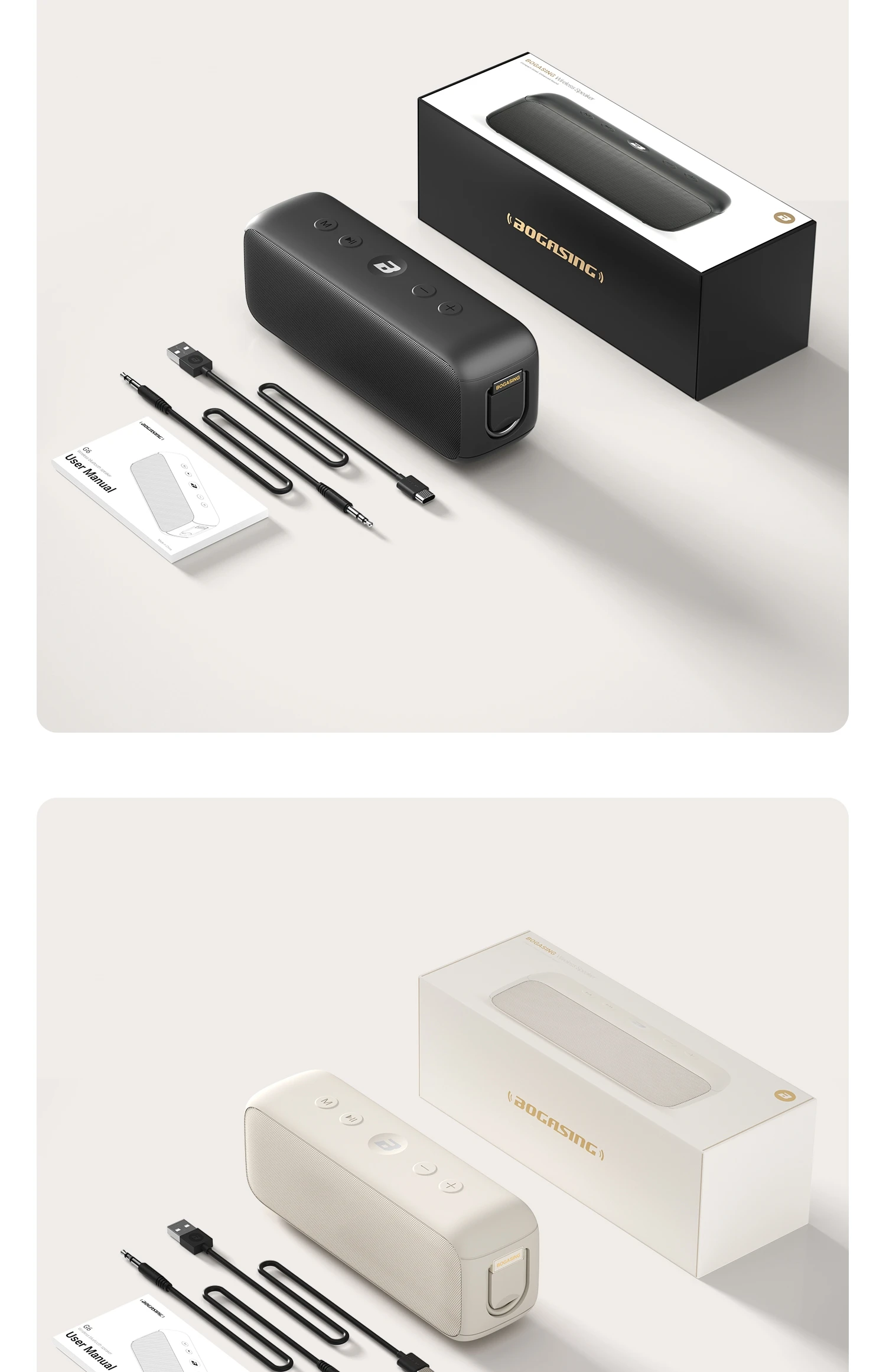 Detalles de la lista: Altavoz G6, cable de carga, cable de audio, manual de instrucciones de 8 idiomas.