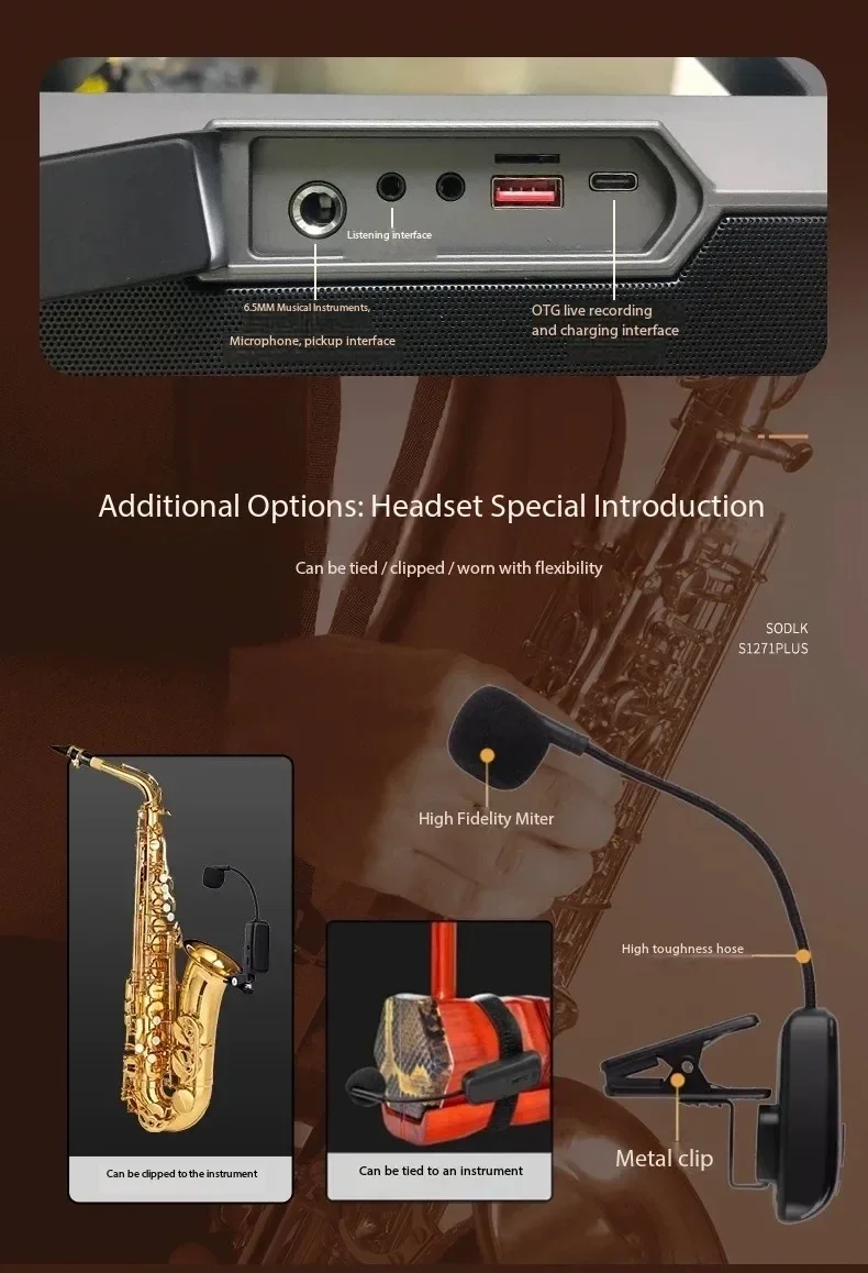 14: Micrófono montado en la cabeza de soporte, ajuste de frecuencia alta, media y baja, ajuste de arriba y abajo, ajuste de reverberación del instrumento