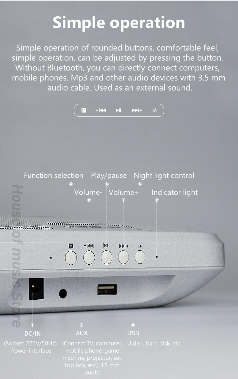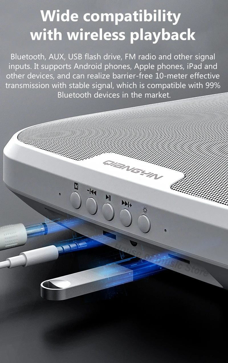 Entrada de señal: Bluetooth 5,0, AUX, unidad flash USB y Radio FM.