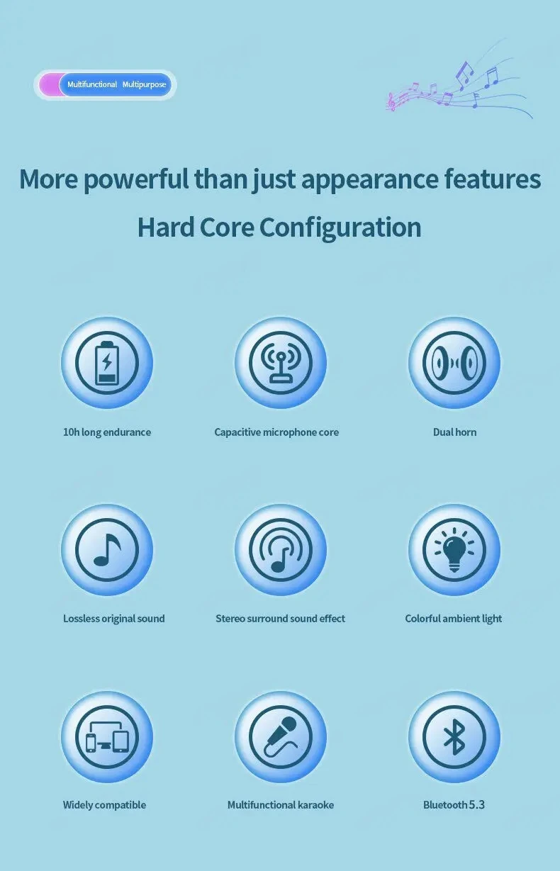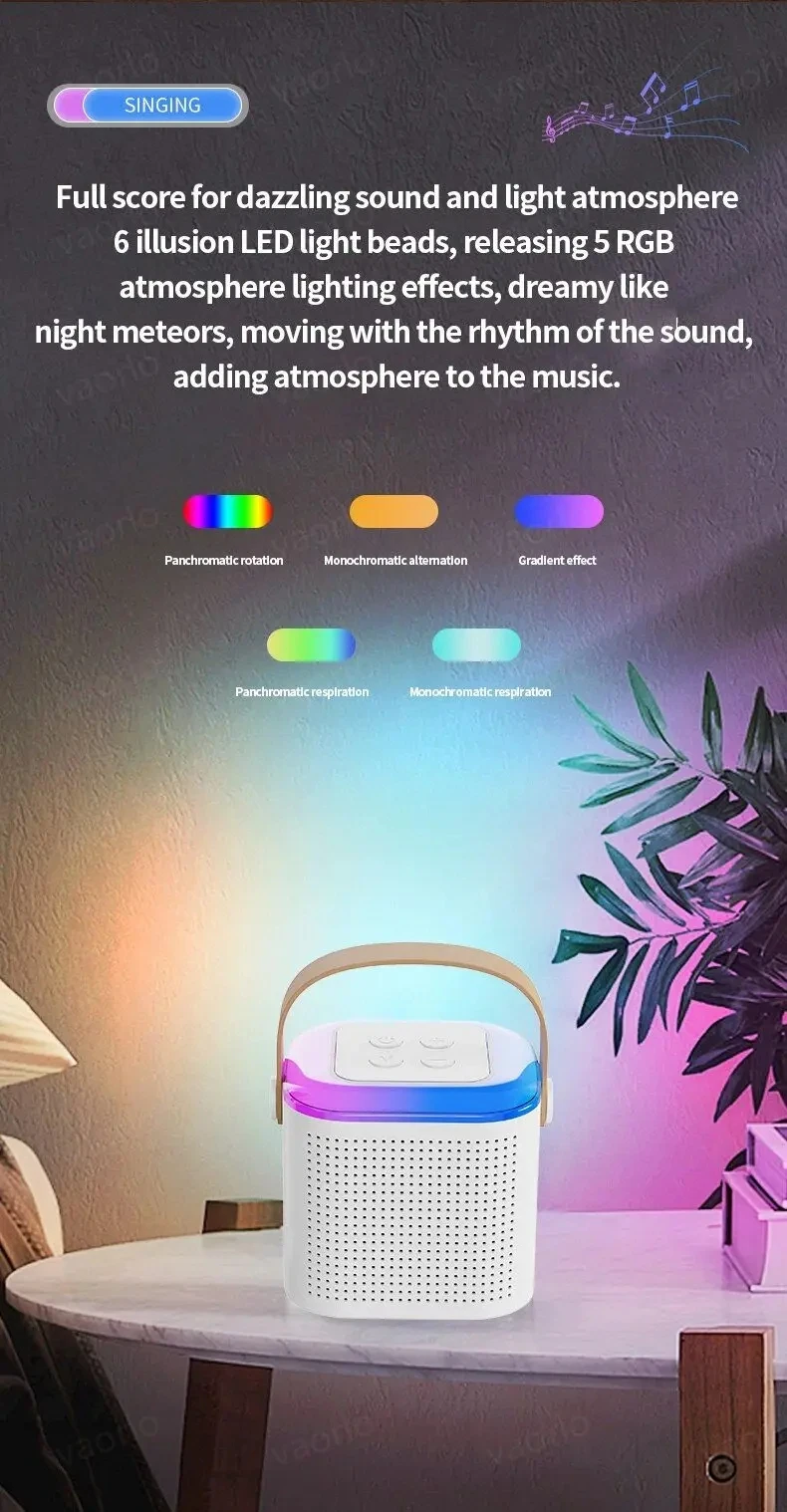 1.Luces LED de colores: el altavoz presenta una variedad de efectos de iluminación de color RGB (rotación a todo color, alternancia de un solo color, efecto degradado, respiración a todo color y respiración de un solo color) que brindan una experiencia musical inmersiva.