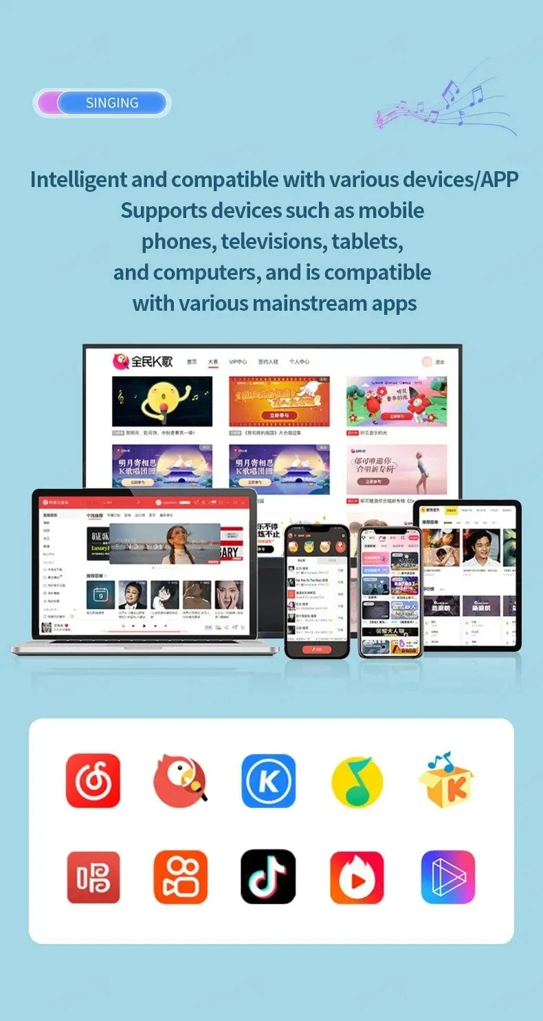 5.En cualquier momento y en cualquier lugar: este dispositivo es fácil de conectar y usar sin ningún cableado complicado.Además, es compatible con una amplia gama de dispositivos (teléfonos, televisores, tabletas, ordenadores, etc.)y aplicaciones, brindando una excelente experiencia de karaoke en casa o mientras viaja.Tenga en cuenta que el televisor necesita tener una función compatible con Bluetooth incorporada o los usuarios deberán comprar un transmisor compatible con Bluetooth por separado.
