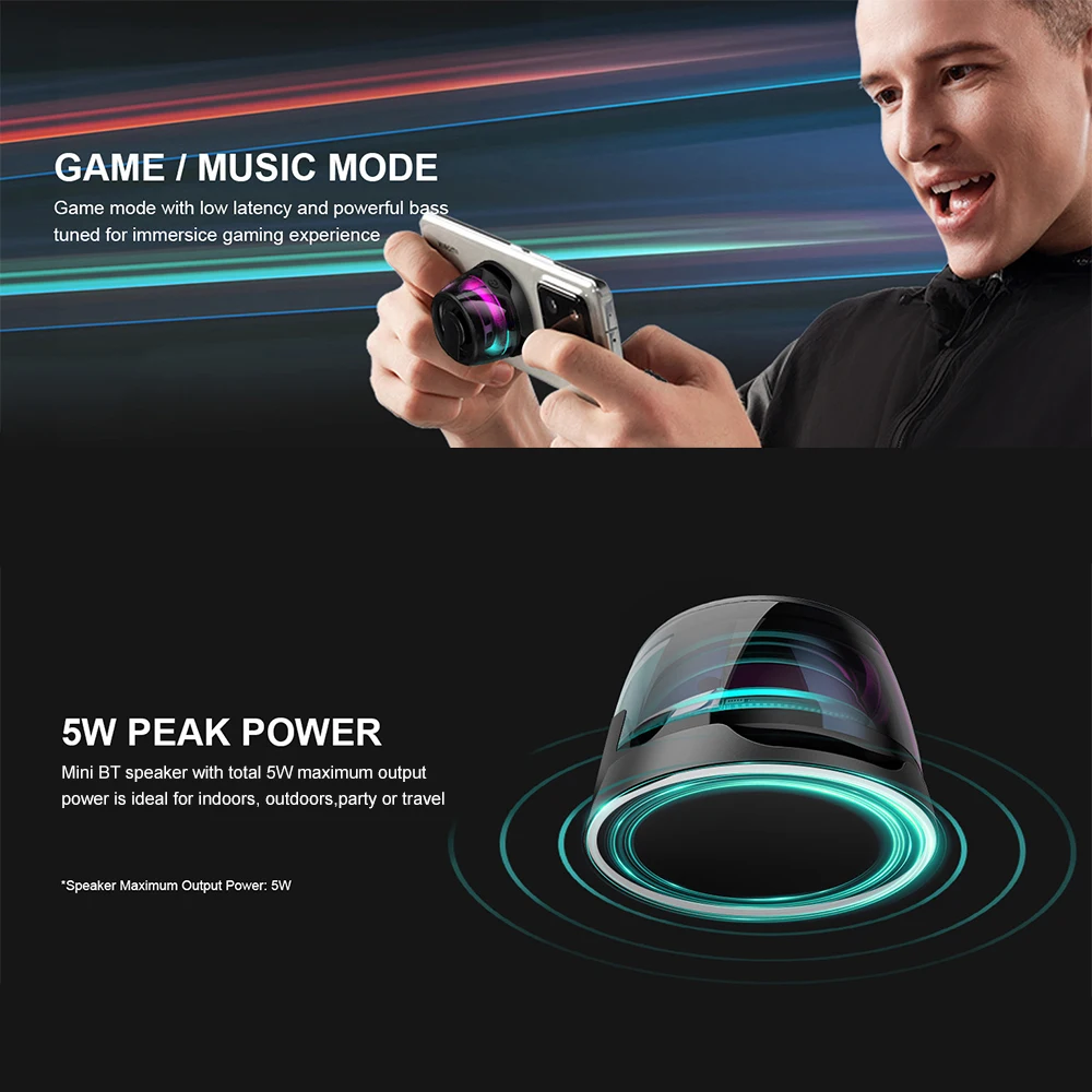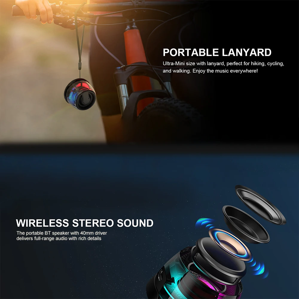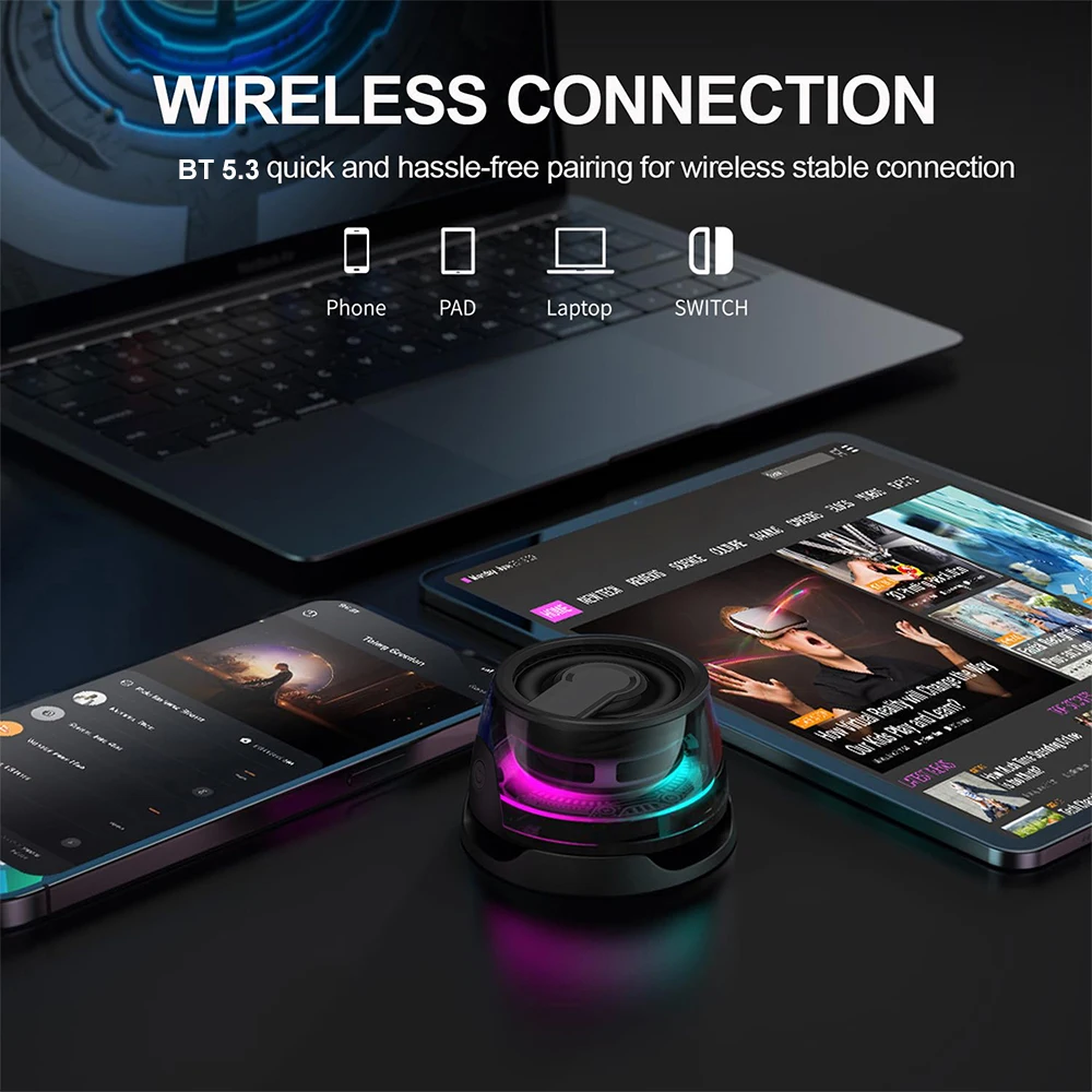 5.Luces LED geniales: el pequeño altavoz inalámbrico Bluetooth tiene un cuerpo transparente y un efecto de iluminación LED, y combina inteligentemente sonido y visión.Nuestro pequeño altavoz portátil es un disfrute visual.