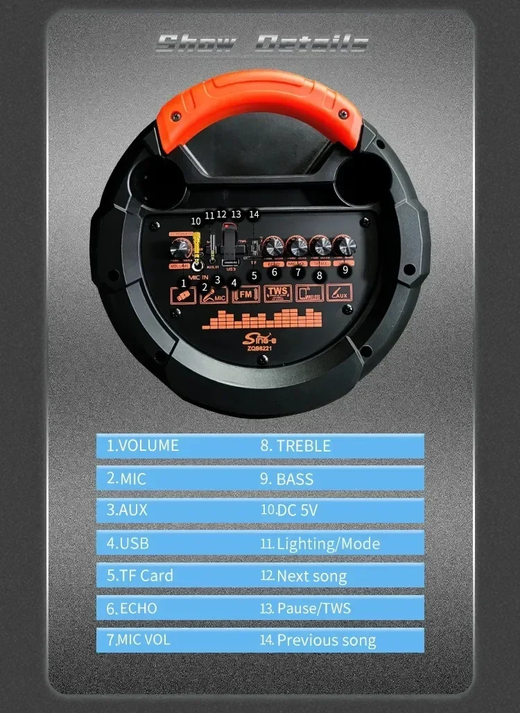 El nuevo y popular altavoz Bluetooth doble de alta potencia de 8 pulgadas con micrófono inalámbrico y control remotoParámetros:Con Bluetooth/con radio/con AUX/USB/tarjeta TF/MIC, carga de la DC-5V, función de caja a caja + USB con refuerzo de 5V/con protección de batería de litio/amplificador de potencia/volumen del potenciómetro, con función de micrófono inalámbrico + tweeter/con luz de siete colores/luz de siete colores controlada por MODEEspecificación de la batería: 18650/3.7V/3600MAHBocina: doble de 8 pulgadasPotencia: 40WAccesorios: cable de carga. Control remoto. (micrófono de carga inalámbrico)Tamaño de la máquina: 310x310x800mmTamaño de la caja de color: 315x315x860mm