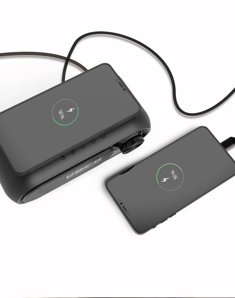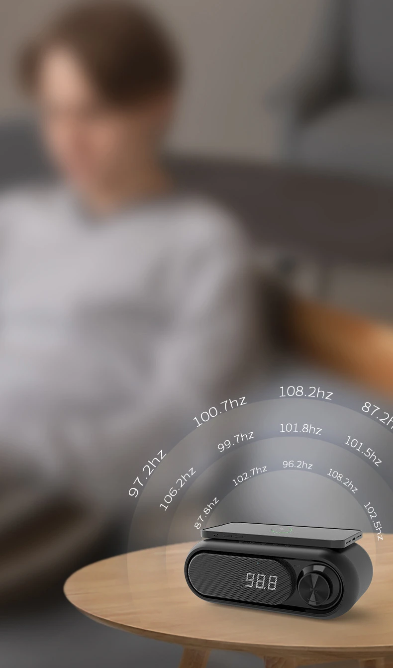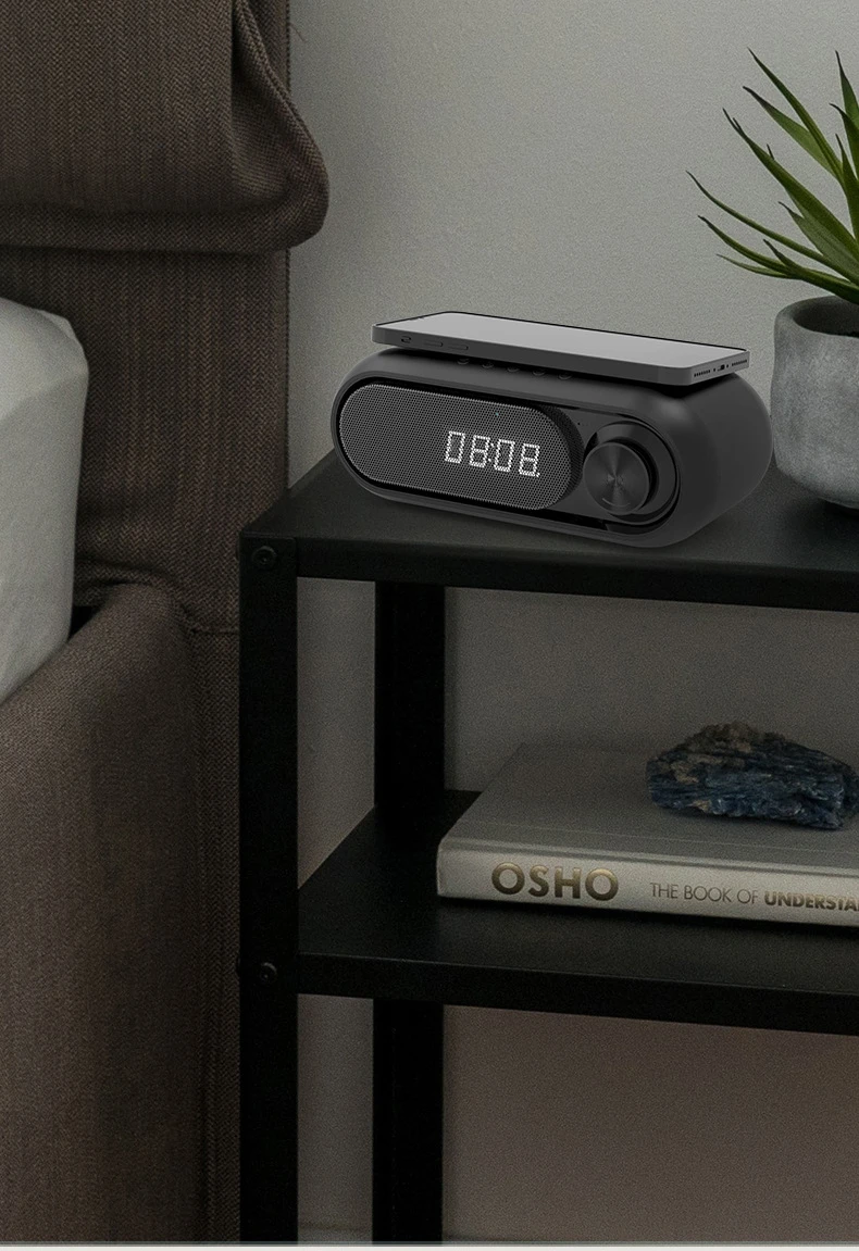 Carga inalámbrica de audio Bluetooth multifunción, puede cargar dos teléfonos móviles al mismo tiempo, reloj despertador, radio, efecto de sonido EQ, BASS, llamadas manos libres.