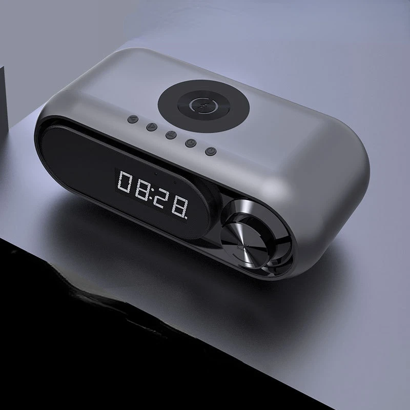 Carga inalámbrica de audio Bluetooth multifunción, puede cargar dos teléfonos móviles al mismo tiempo, reloj despertador, radio, efecto de sonido EQ, BASS, llamadas manos libres.
