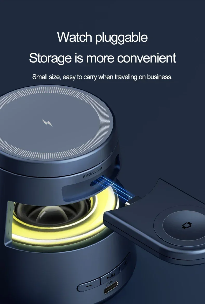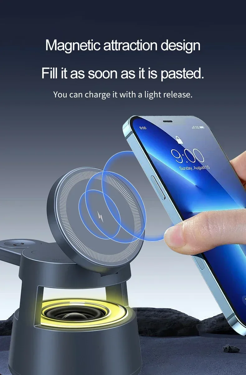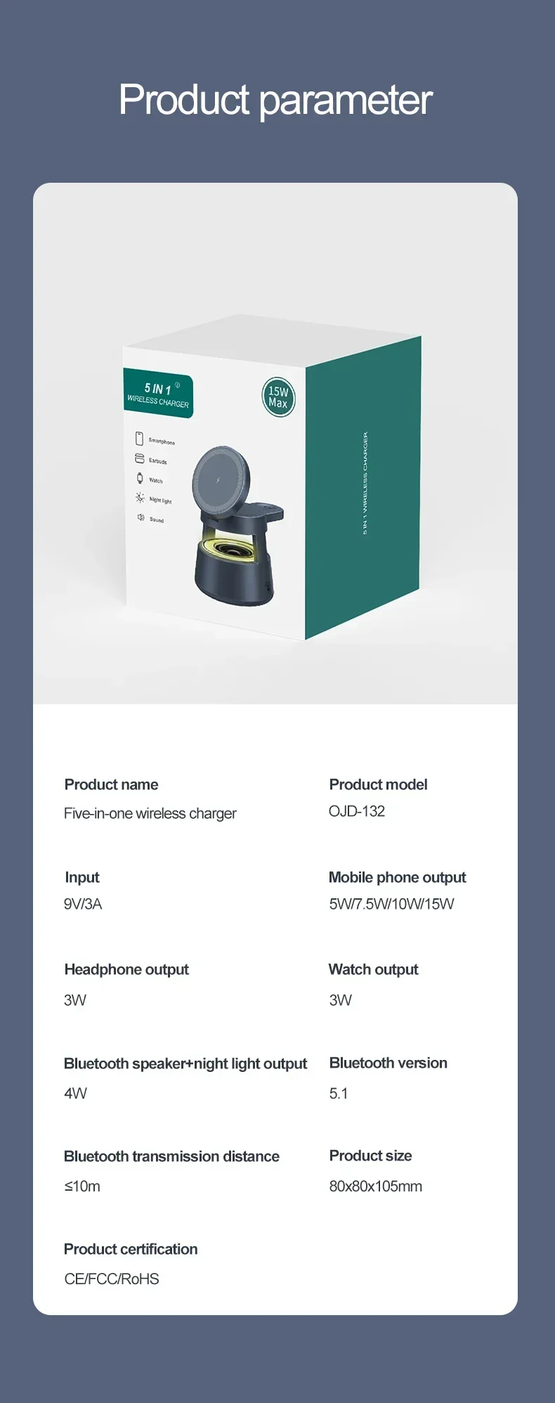 1.Cargador inalámbrico 4 en 1: el producto tiene función de carga inalámbrica, que puede admitir la carga inalámbrica de una variedad de dispositivos al mismo tiempo, de manera conveniente y rápida.