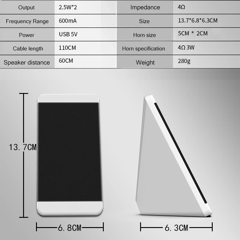 Solo necesita un puerto USB para cargar, el altavoz es compatible con todos los dispositivos de interfaz de audio de 3,5 mm, como computadoras de escritorio, portátiles, teléfonos móviles, MP3, MP4, etc.