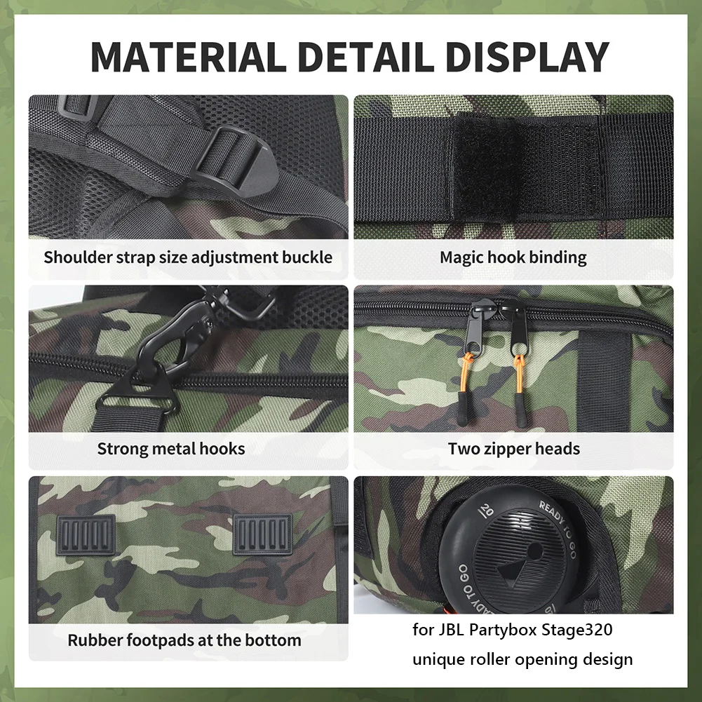 ompatible with JBL Partybox Stage 320 speaker. The top of the bag features a transparent window design, allowing you to quickly and clearly see the power and volume buttons for easy adjustments. The side of the bag has a zipper opening that matches the original zipper of the speaker, and the top also includes a retractable pocket for added convenience.