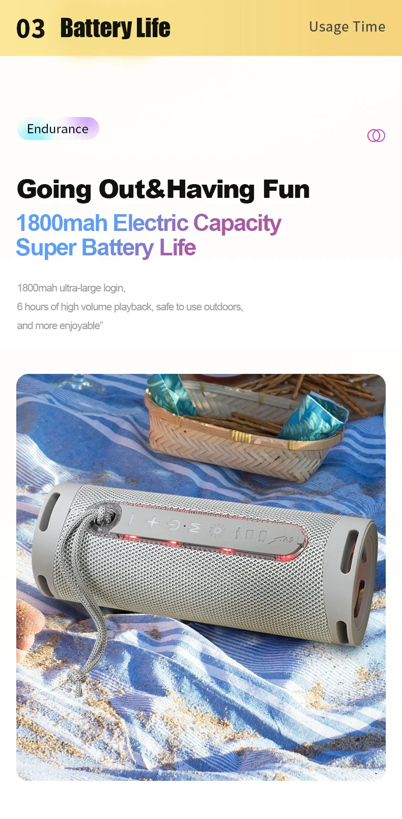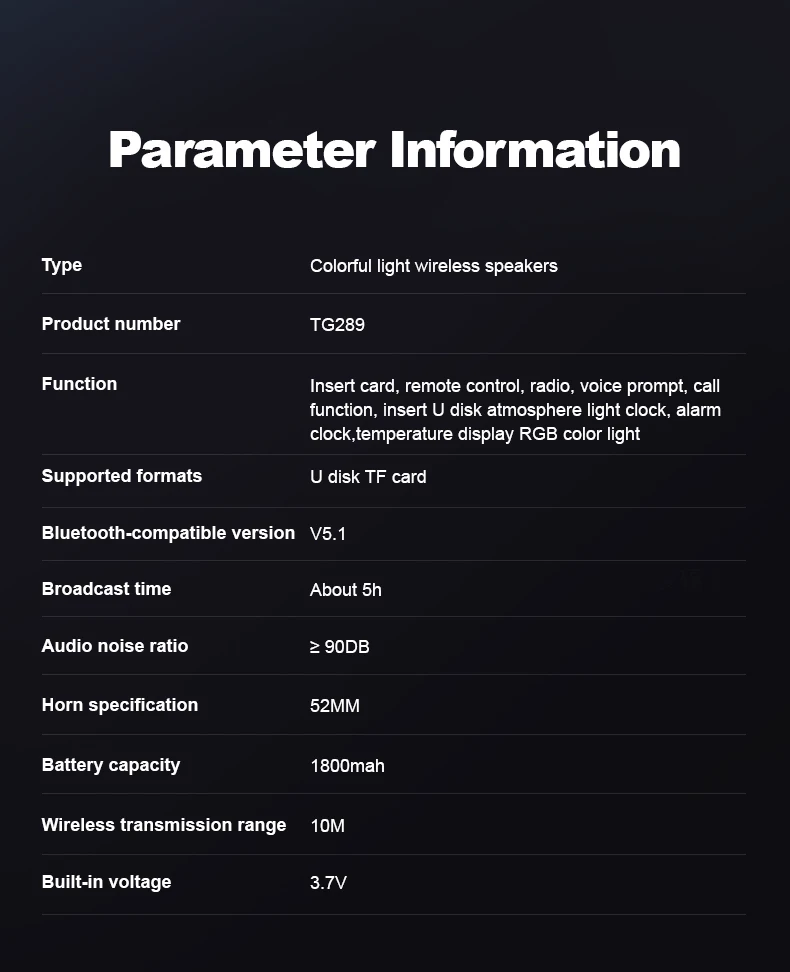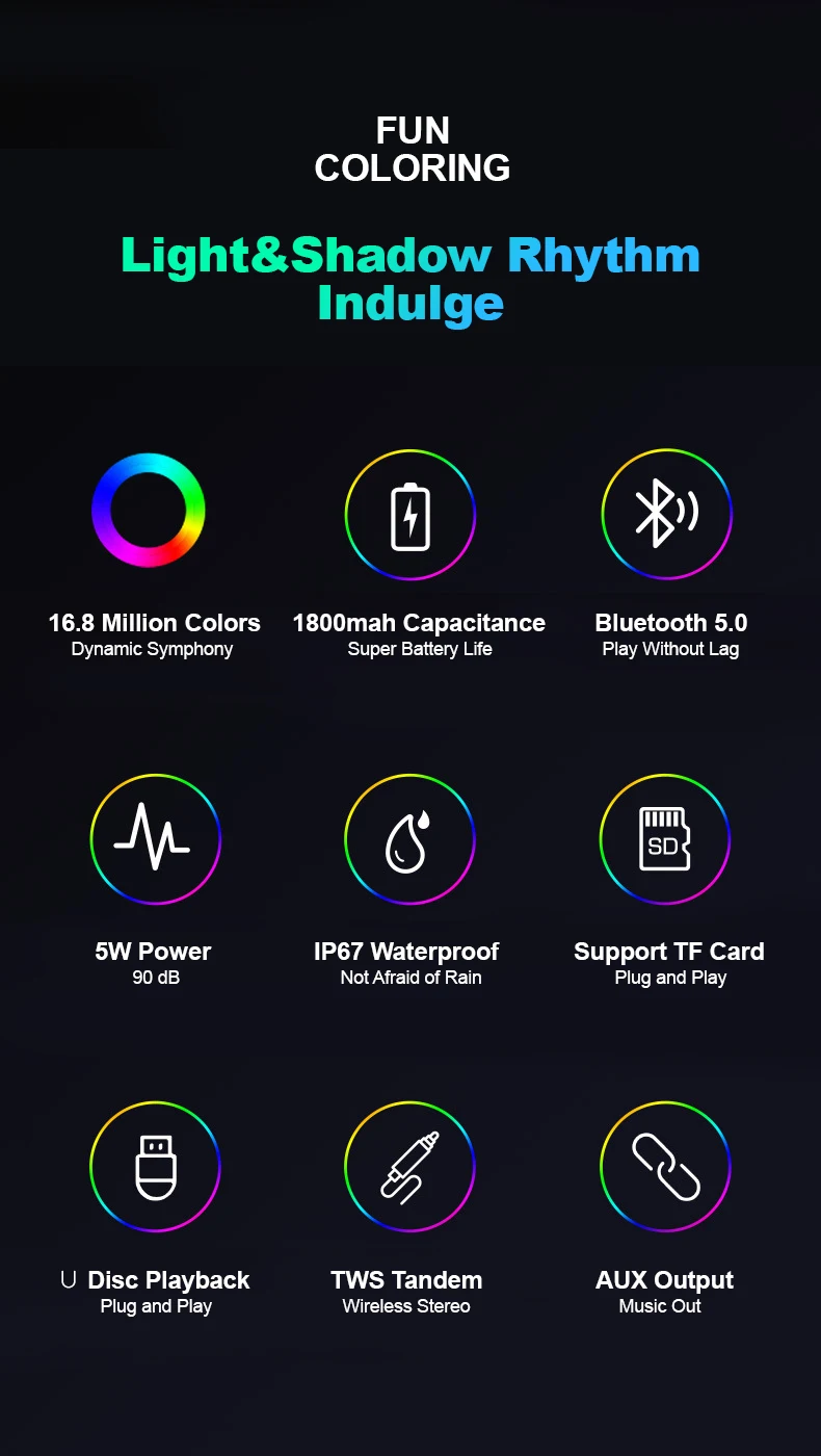 Bluetooth, portátil, FM, tarjeta TF, USB, entrada LINE IN, función de llamada, luces LED de modo intermitente múltiple, TWS