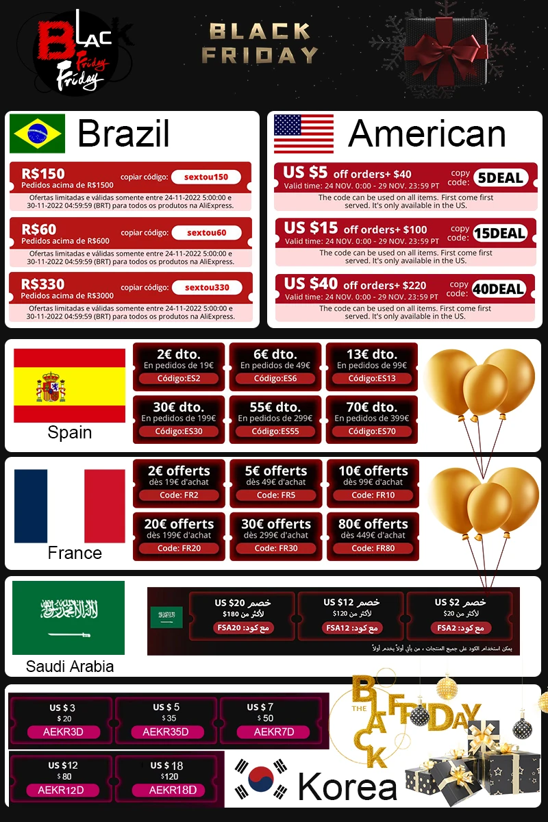 Estimado/a amigo/a, el tiempo de uso del código promocional de las rebajas del Black Friday es: De 2022.11.24 a 2022.11.29, úsalo en las primeras 2 horas debido a la cantidad limitada.