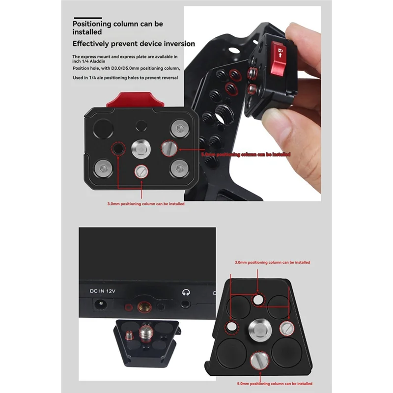 Positioning columns can be installed to effectively prevent equipment from reversing. The quick release seat and quick release plate both have British 1/4 Arri positioning holes, which can be used with D3.0/D5.0mm positioning columns and used in 1/4 Arri positioning holes to prevent reversal