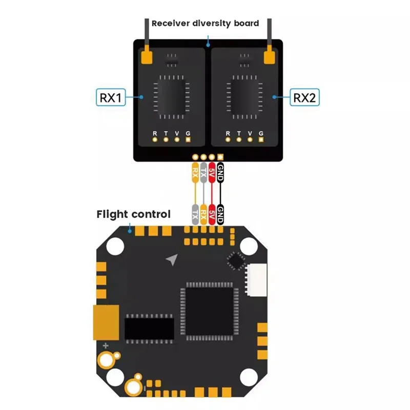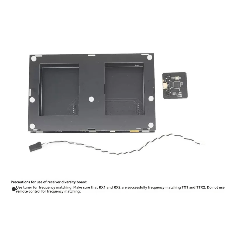 Precautions for using the high-frequency head diversity board: The remote control should be configured as an external high-frequency head; Set the serial port baud rate of CRSF on the remote control to 921K; The telemetry rate of the two high-frequency heads is set to the same, and it is recommended to set them to 1:64; The packet rate of each of the two high-frequency heads should not be higher than 250Hz; The power input range of the high-frequency head diversity board is 6-35V. The key reference is the voltage input range supported by the high-frequency head, and 2-3S batteries are recommended.