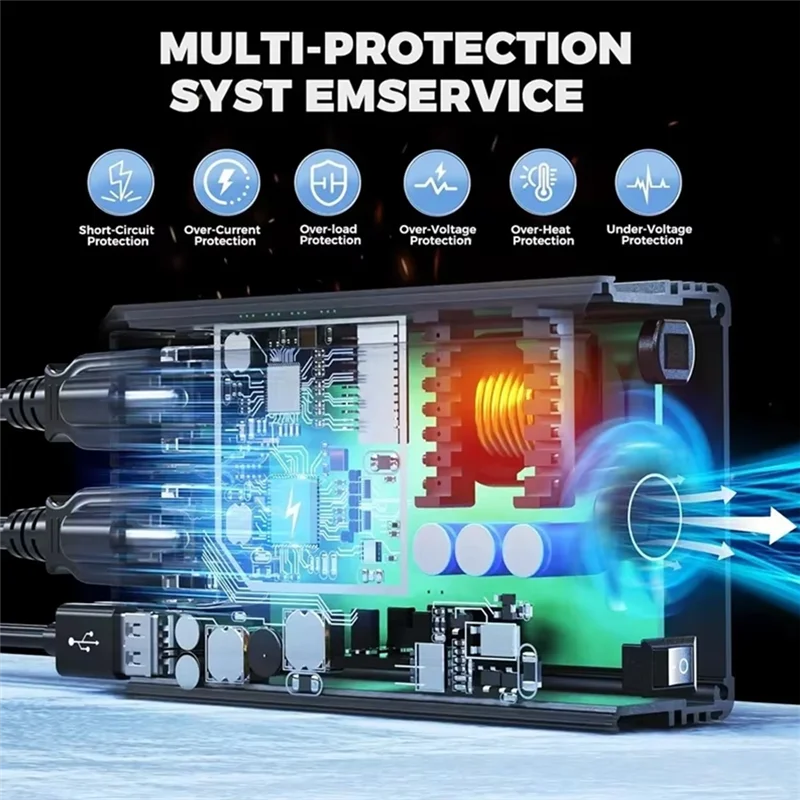 Protección avanzada de bajo voltaje: los mecanismos integrados de protección contra sobrecarga, sobrecorriente, sobretemperatura y bajo voltaje apagan automáticamente el inversor cuando el voltaje de la batería cae por debajo de 15 V o sube por encima de 24 V, evitando la sobredescarga y garantizando un estado de batería duradero.