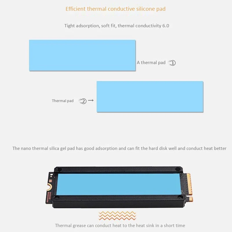 5.El radiador está equipado con una almohadilla térmica de nanocilicona, con una conductividad térmica de 8 W/km, que puede conducir bien el disco duro al disipador de calor.