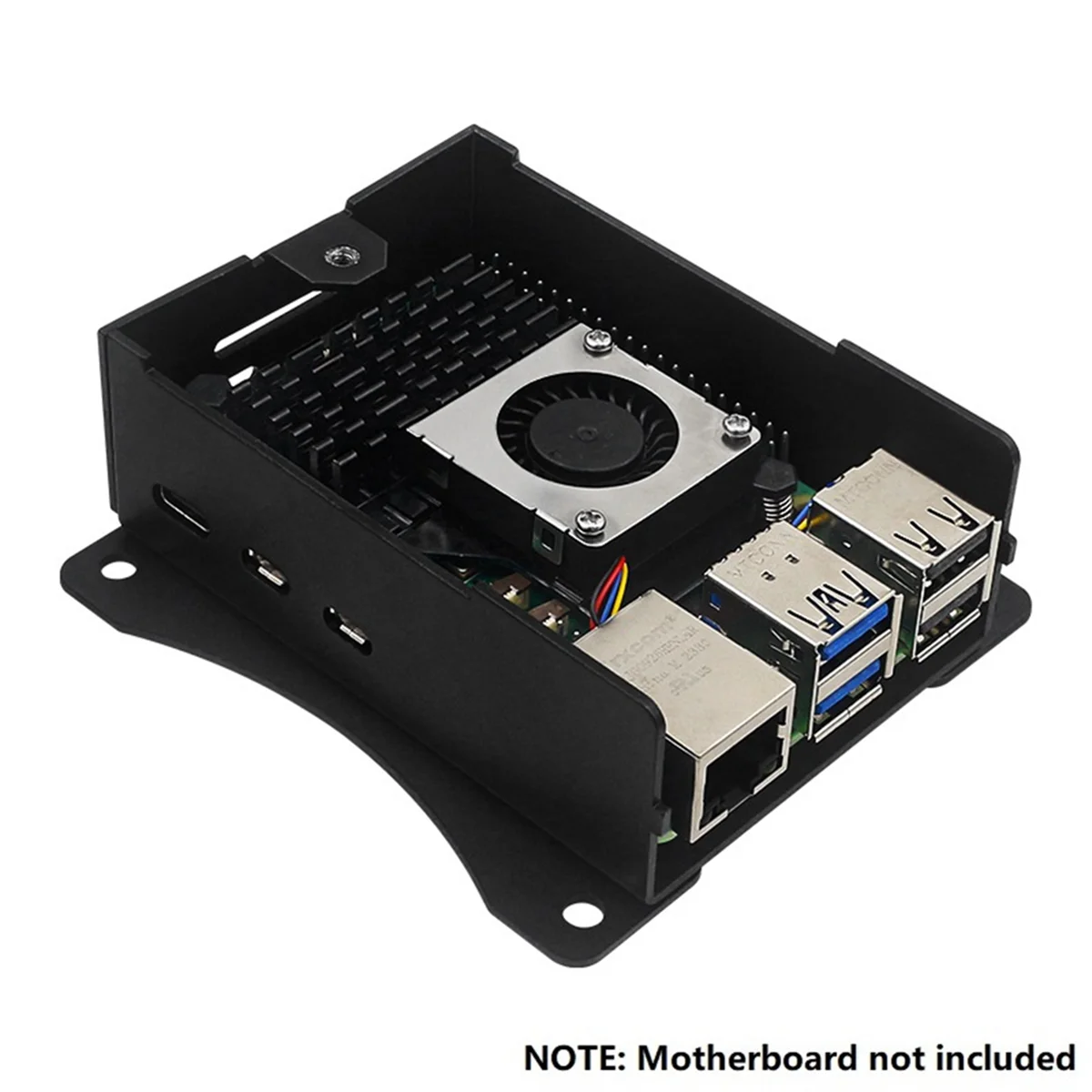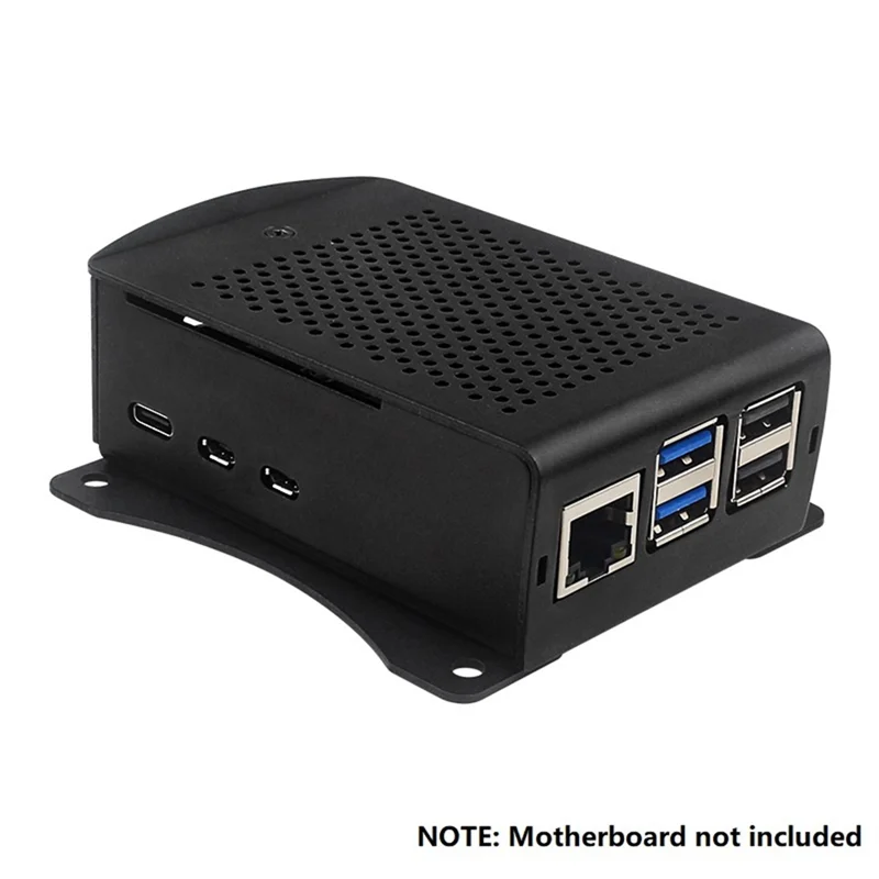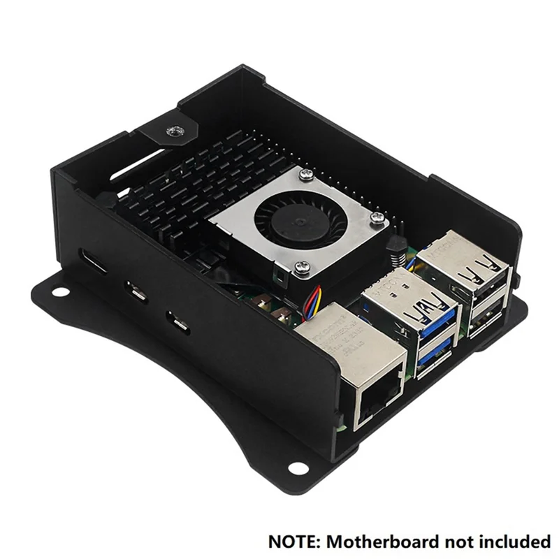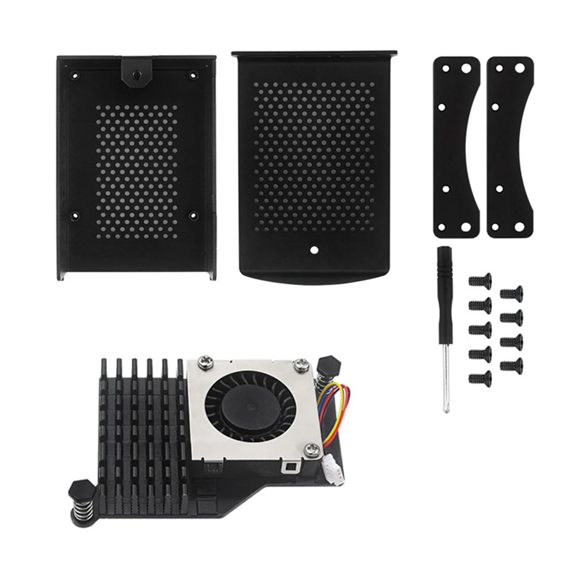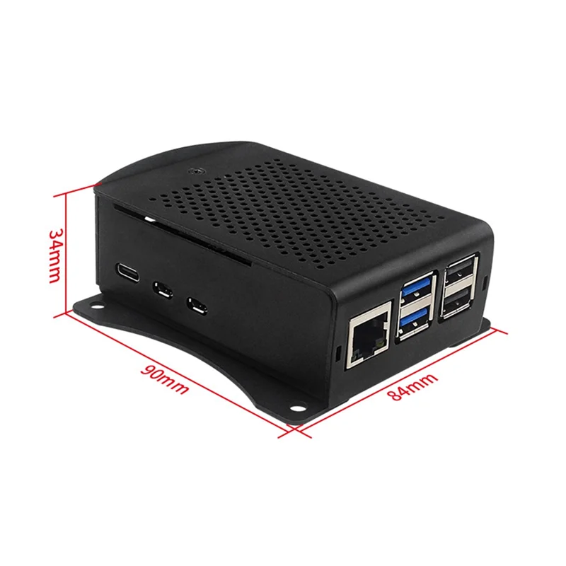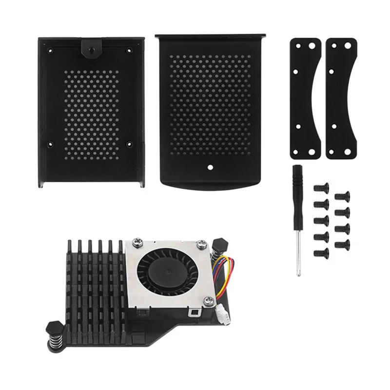 Aluminum alloy shell for Raspberry Pi 5. lightweight and sturdy, easy to carry, equipped with hole wall bracket. With a mesh structure on the top cover, good heat dissipation performance. Compatible with for official radiator fans. Material: Aluminum alloy colour: Black / Black+Silver