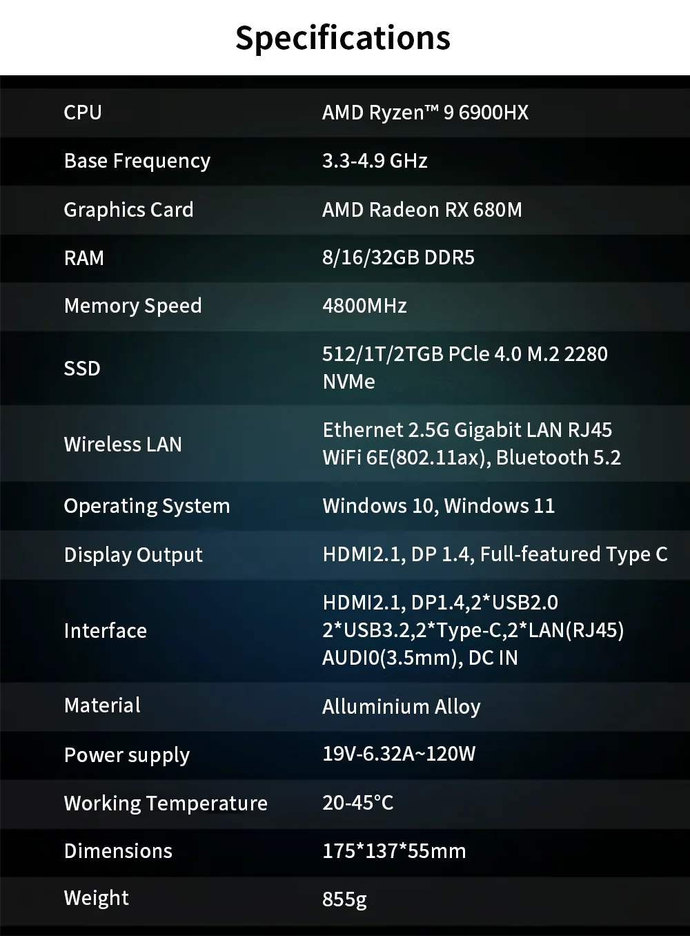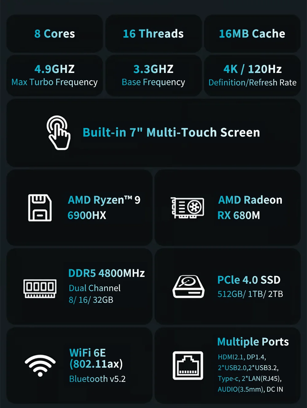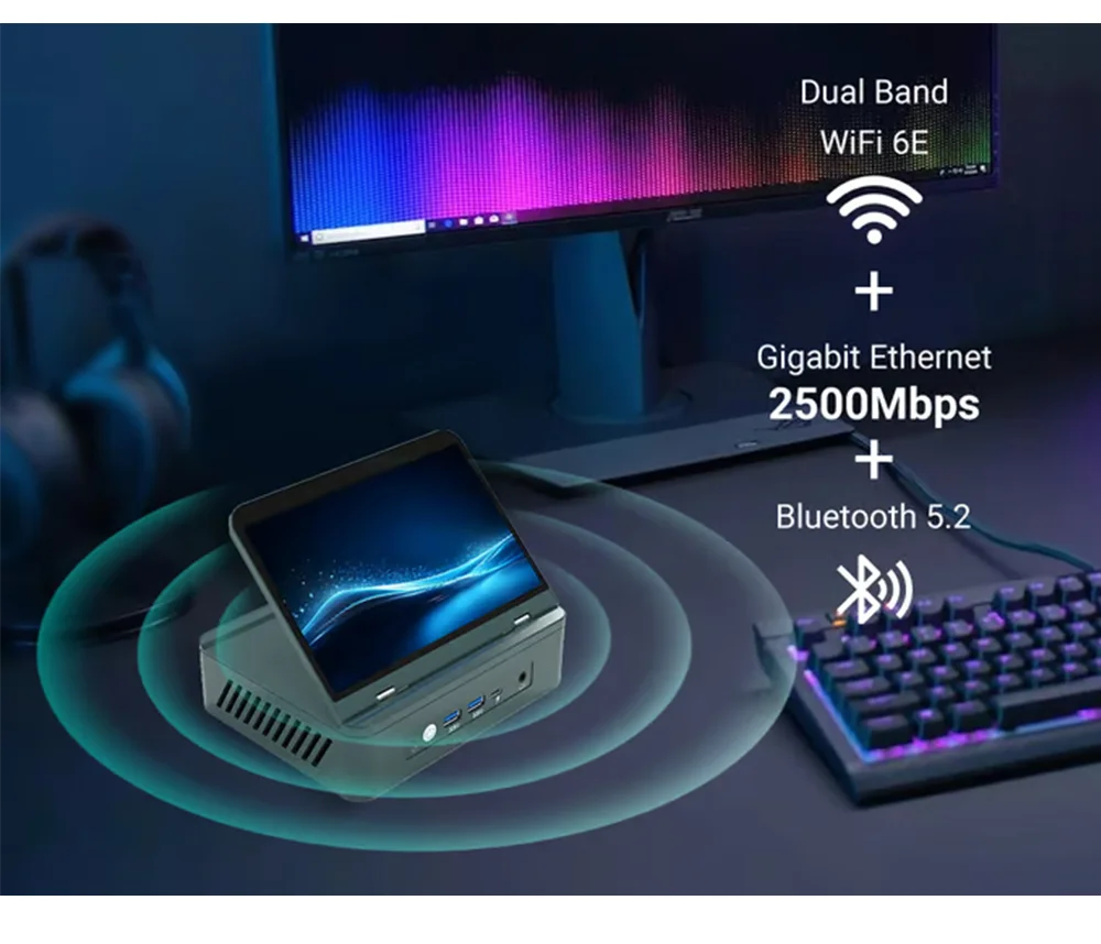 AMD 7 "pantalla Mini PC Ryzen 9 6900HX 8 Core DDR5 2xLAN 2,5G NVMe 2 * tipo C pequeño ordenador de oficina/hogar WiFi6 BT5.2 HD DP 7640HS