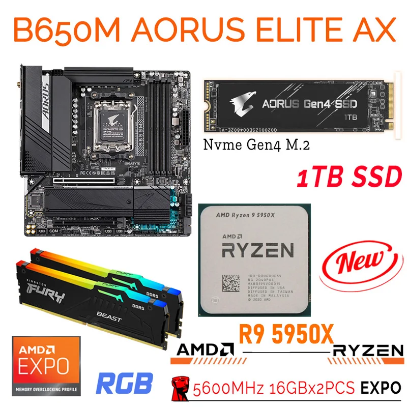 Cpu cambo AMD RYZENR9 5950X+ GigabyteHACHA ELITE AORUS B650MSocket AM5 placa base + Kingston5600MHz 32GB RGBKit RAM Sin Batería Nuevo
