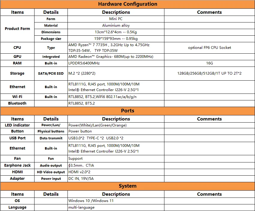 Comprar AMD Ryzen 7 7735H Mini PC 16G LPDDR5 2xHD tipo C RTL8111G 2,5G i226V LAN ordenador Pokect de oficina/hogar Win 11 M.2 2280 hasta 2TB