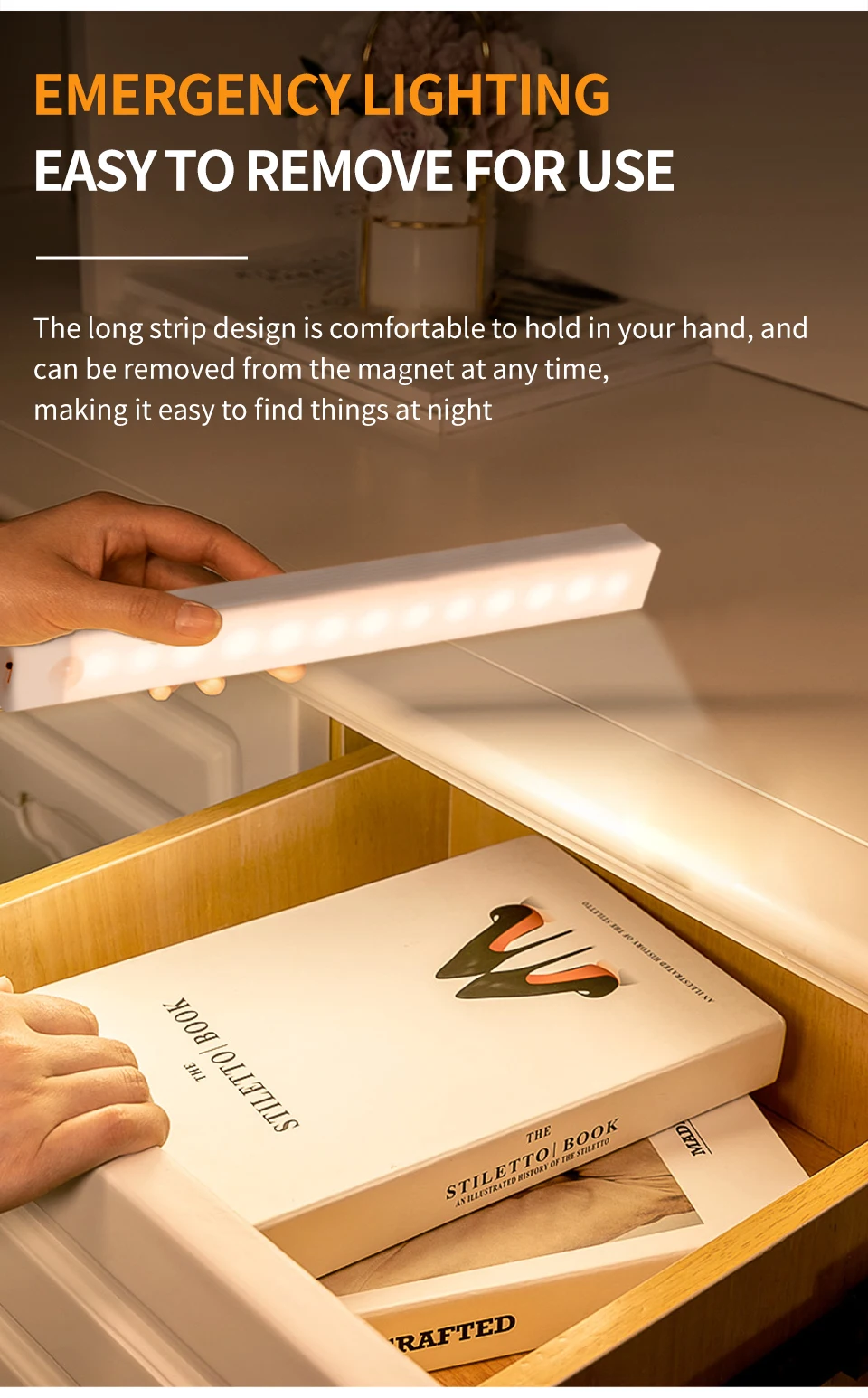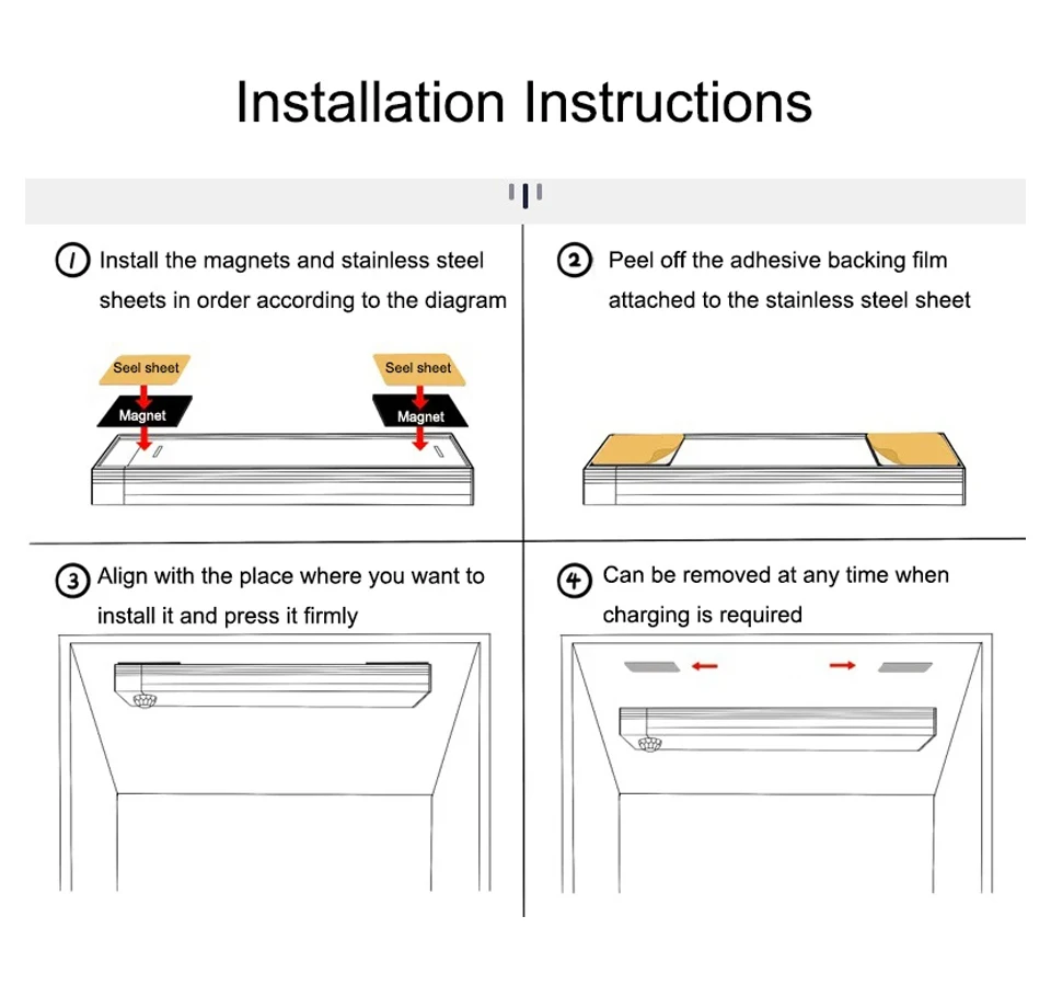 • Luz magnética larga :La luz magnética larga se adhiere a su armario, ahorrando espacio y proporcionando una iluminación eficiente.