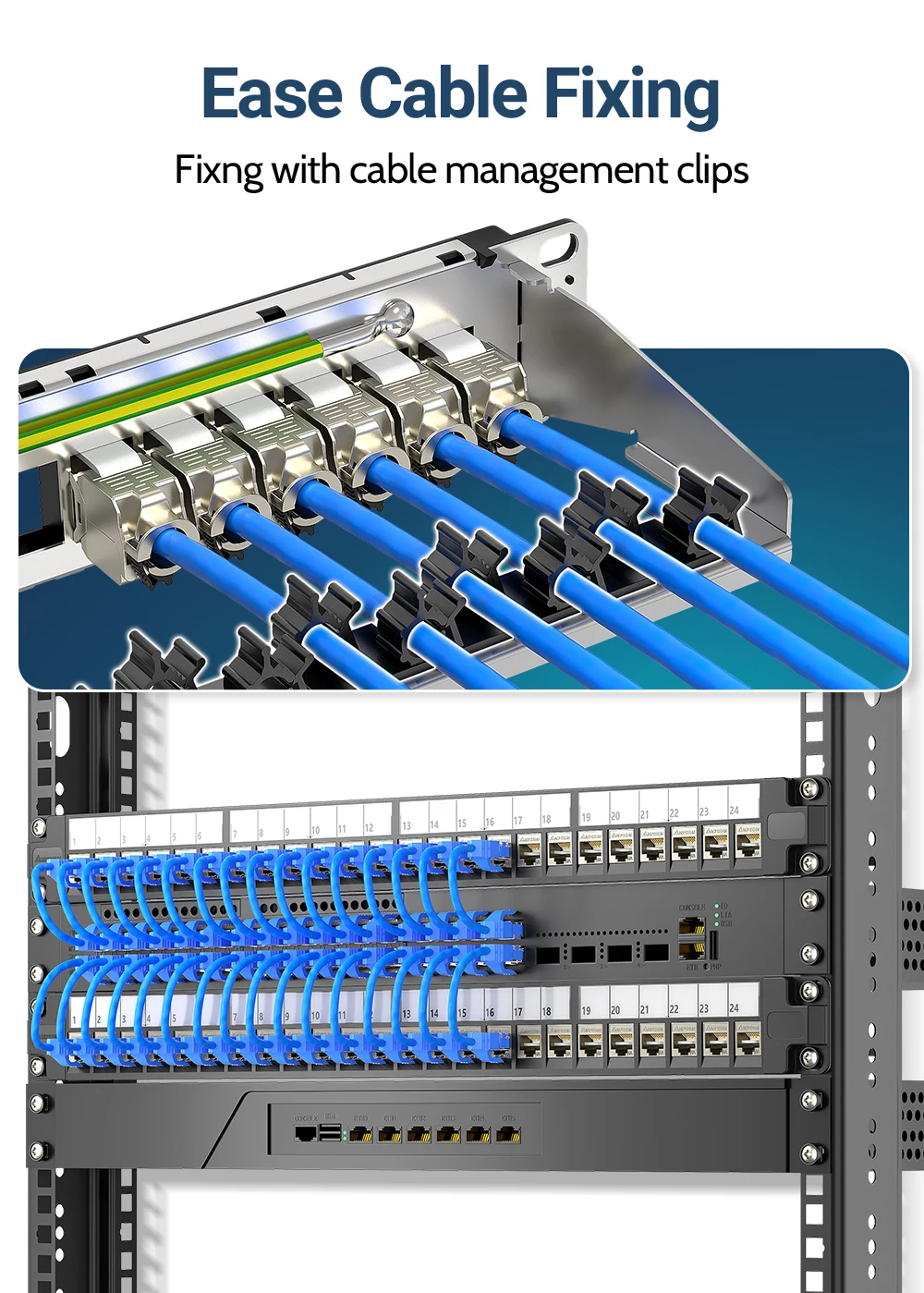 Instalación sin herramientas y gestión simplificada: el diseño plug-and-play sin herramientas reduce el tiempo de instalación en un 60%, con un panel de conexión 1U de 24 puertos de alta densidad con barras de soporte desmontables y clips de gestión de cables para una instalación sin esfuerzo