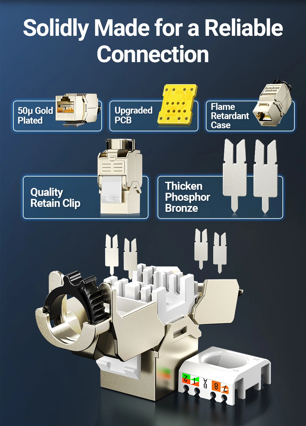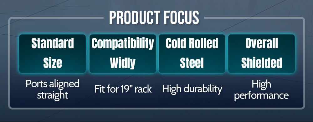 Alta compatibilidad y construcción duradera: tamaño estándar con alineación de puerto recto, compatible con bastidores de 19'' y construido con acero chapado en oro para mayor durabilidad y conectividad confiable