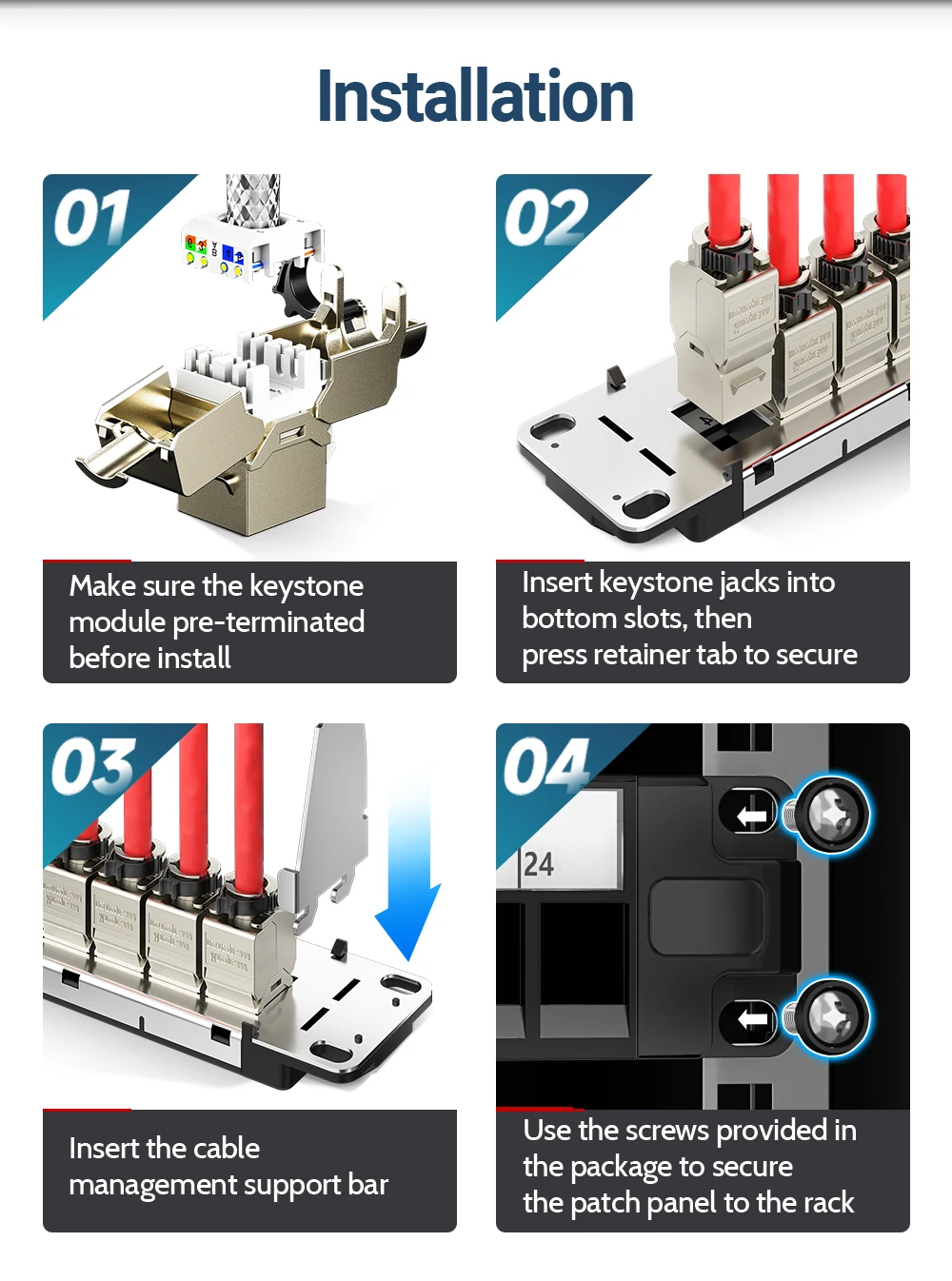 ● El paquete incluye:Panel de conexión Keystone en blanco 1U * 1 pieza, barra de gestión de cables trasera * 1 pieza, gato CAT6/CAT6A/CAT7/CAT7A/CAT8 conector Keystone * 24 piezas, juego de tornillos y tuercas * 4 piezas, mini pelacables * 1 pieza