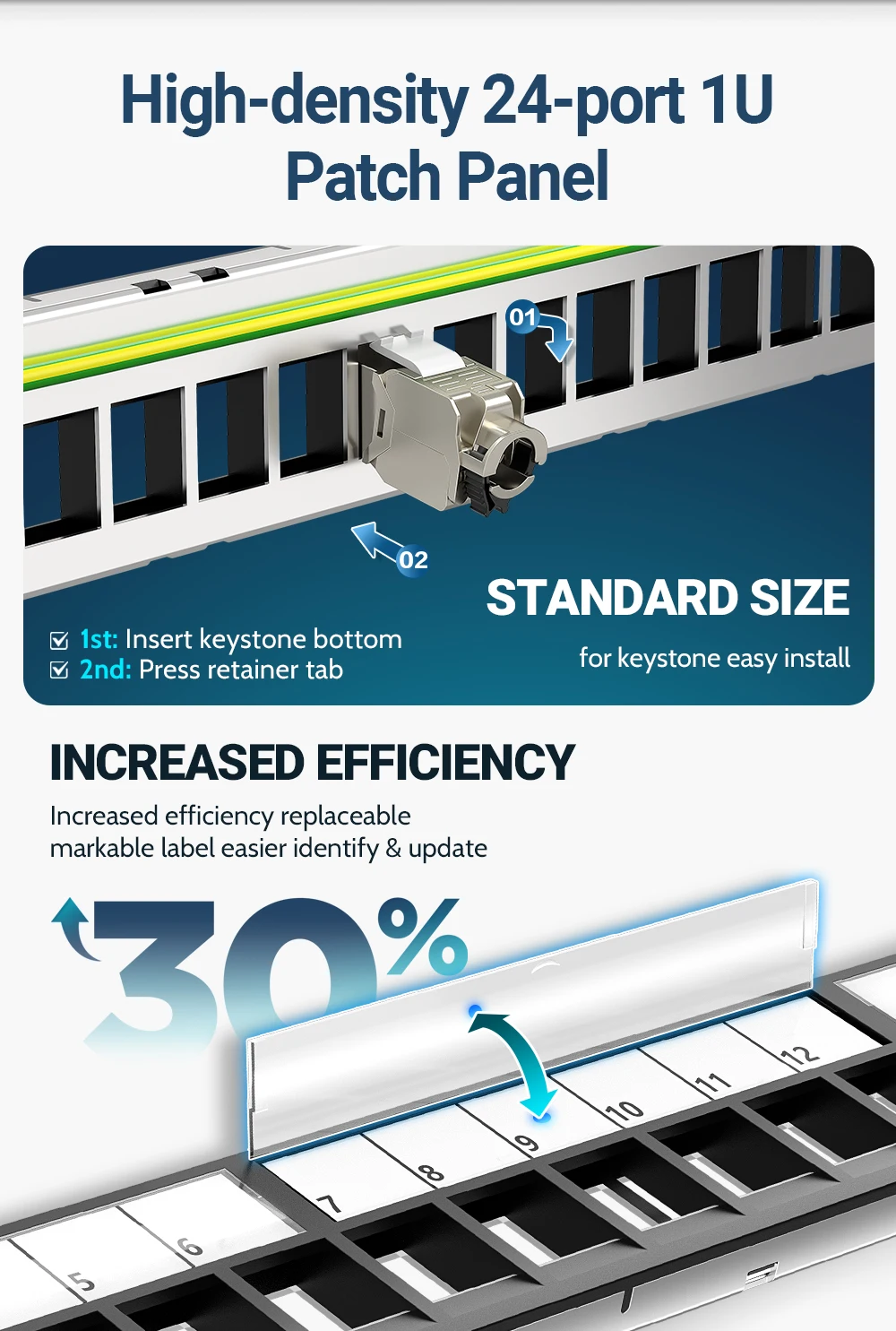 Alto rendimiento y configuración flexible: el diseño completamente blindado garantiza una transmisión de alta velocidad, compatible con Ethernet (RJ45) STP/UTP, coaxial (tipo F), HDMI, USB y acopladores de fibra óptica, con etiquetado reemplazable para una fácil identificación y actualizaciones
