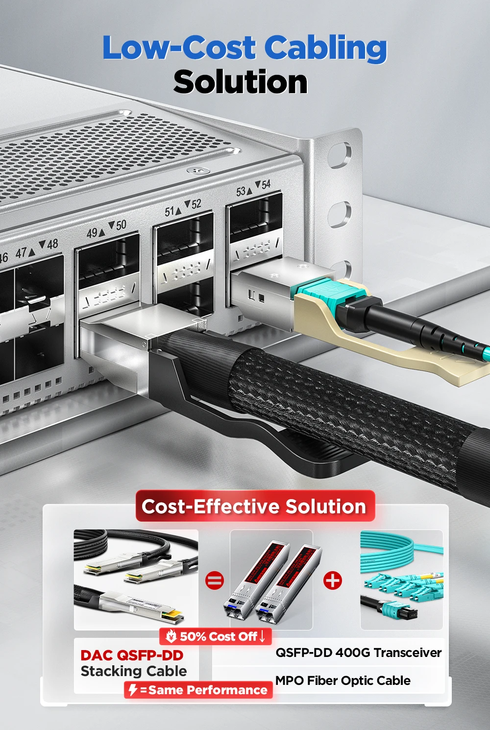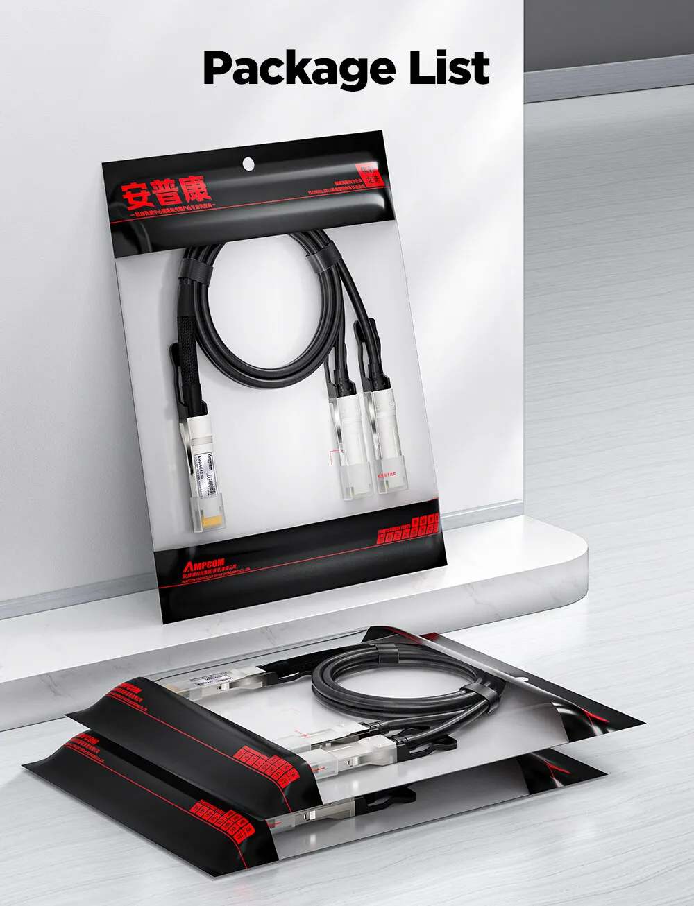 Direct attach copper breakouts is suitable for very short links and offer a cost-effective way to establish a 400-Gigabit link between SFP56 200G ports within racks and across adjacent racks